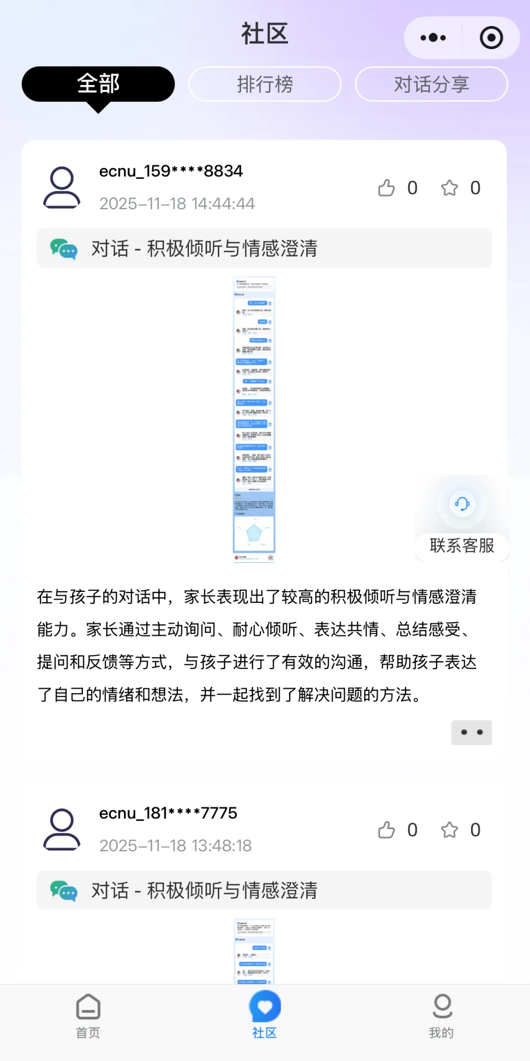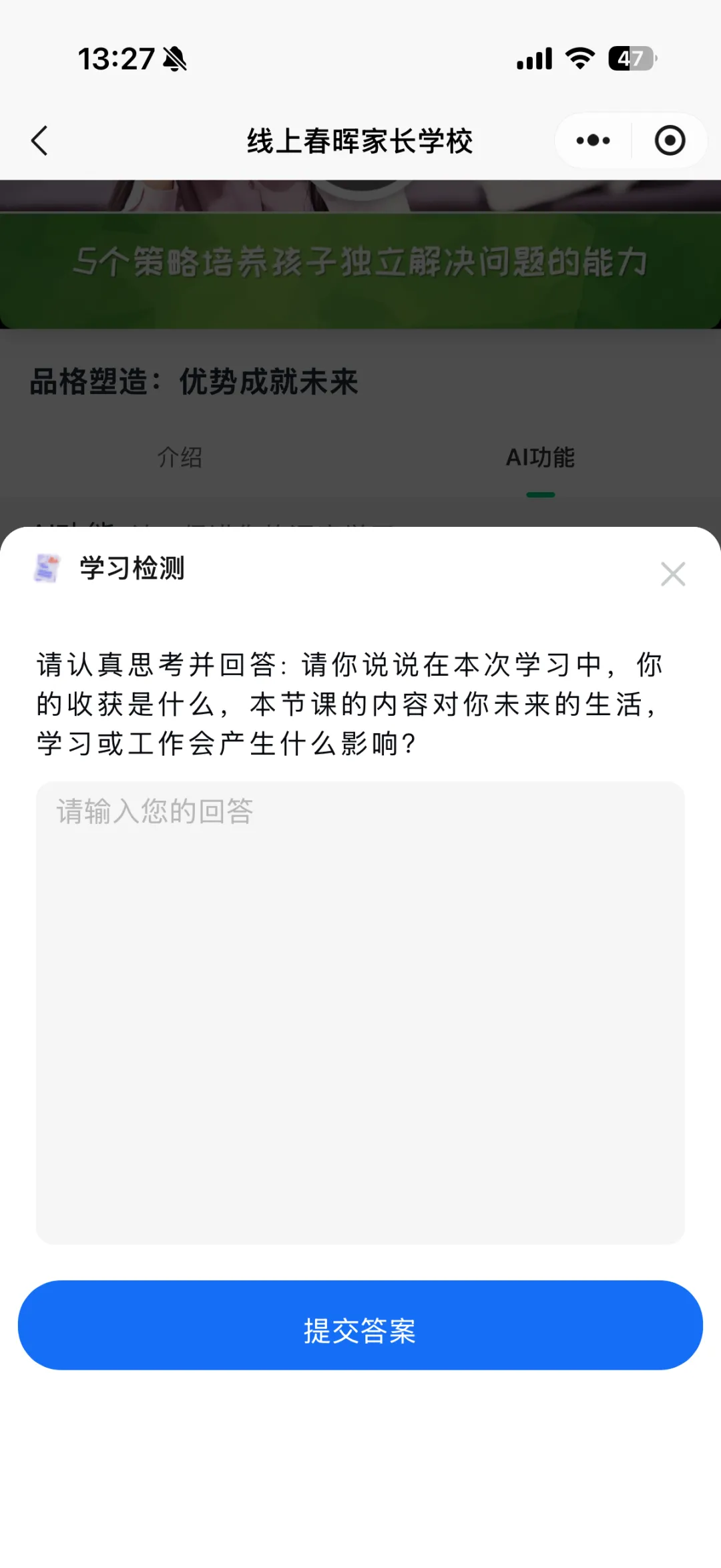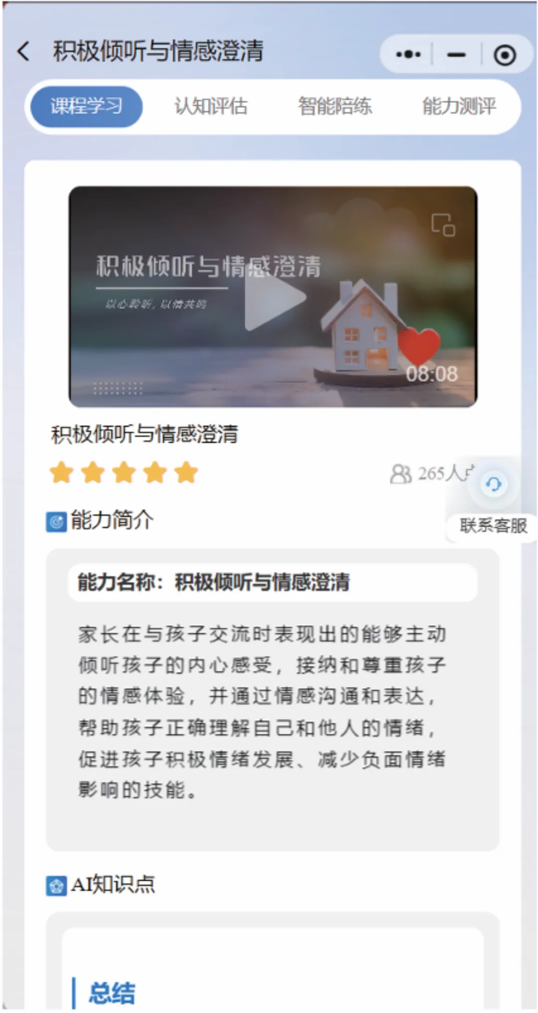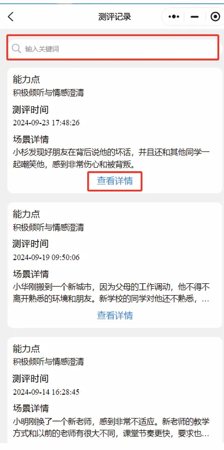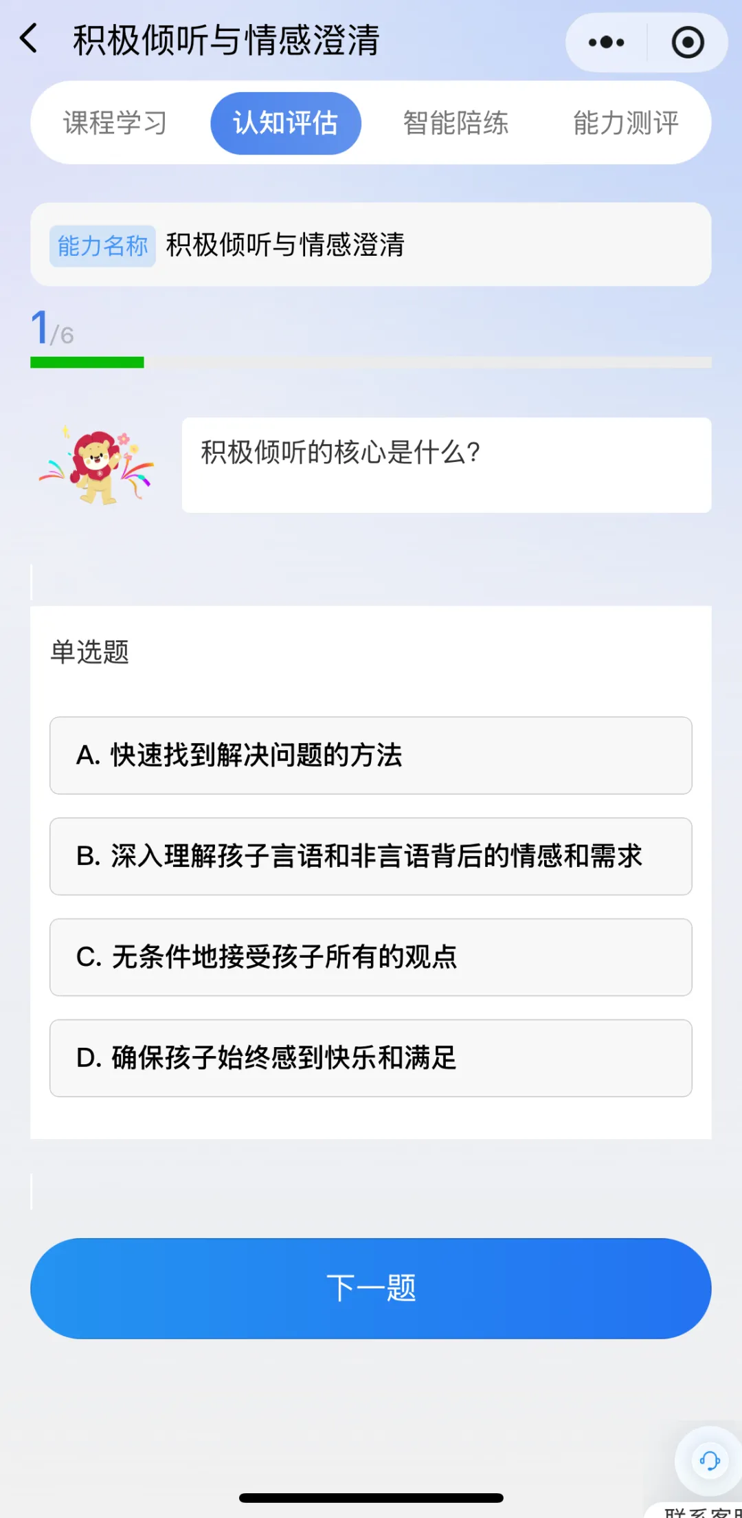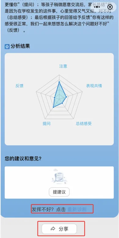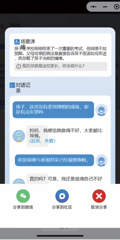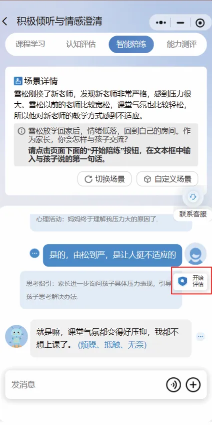 通过情景化测评量化家长的能力,帮助家长识别优势和不足。相对于“智能陪练”模块,这里没有指引,更像实战“考试”。