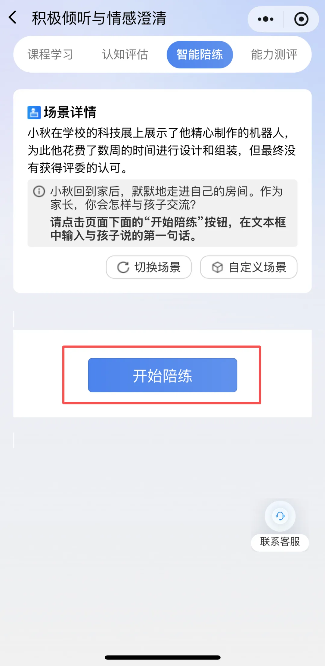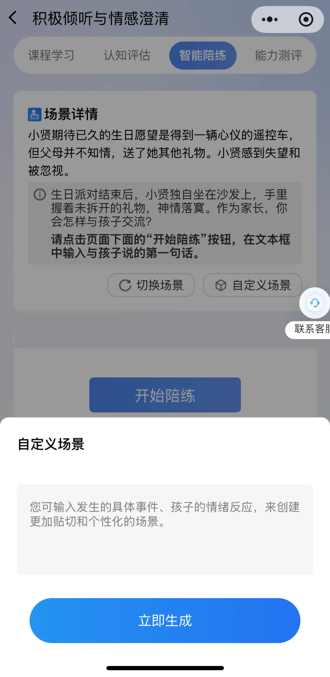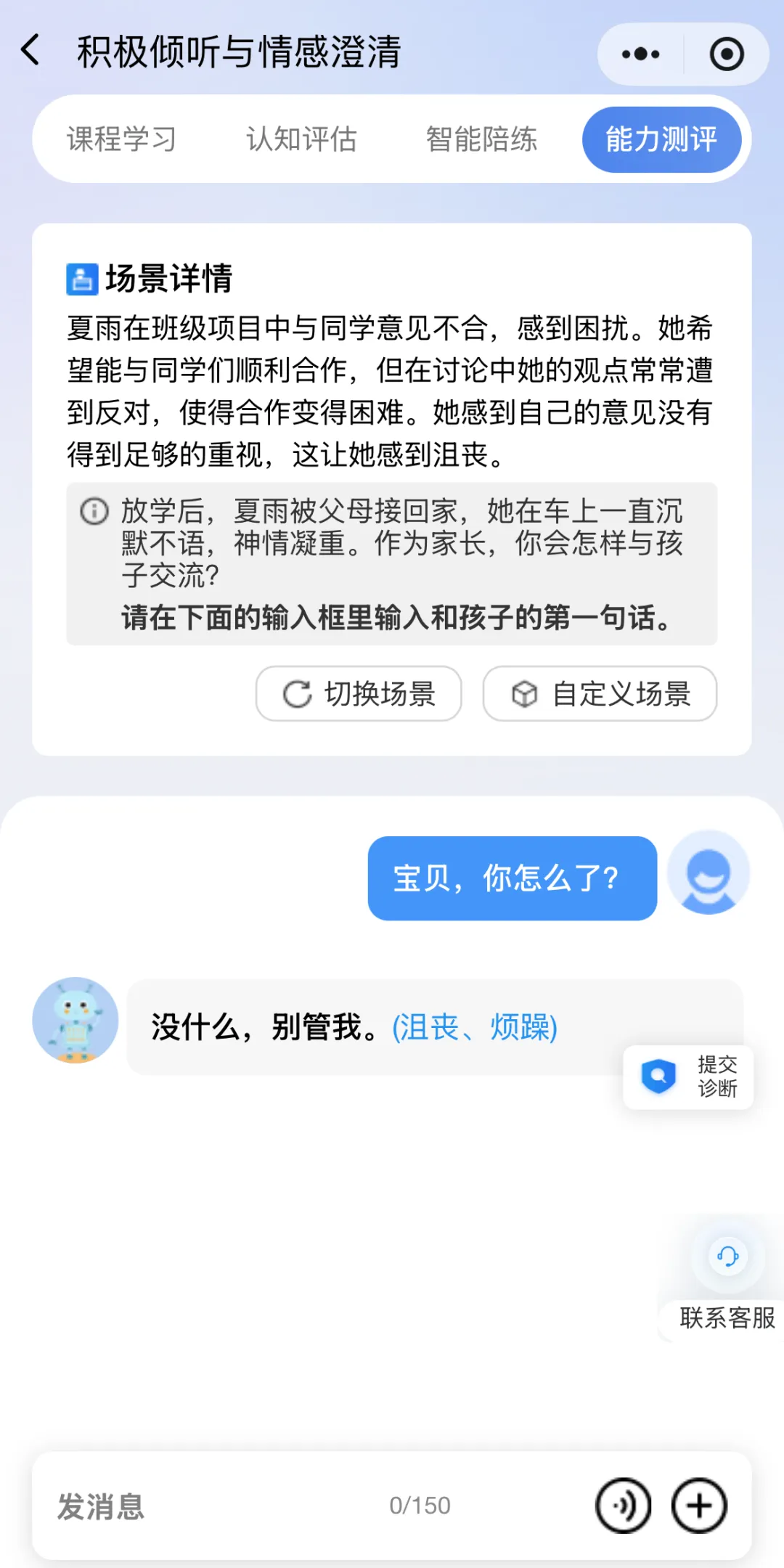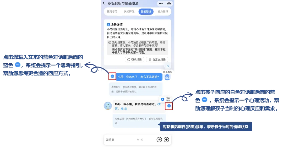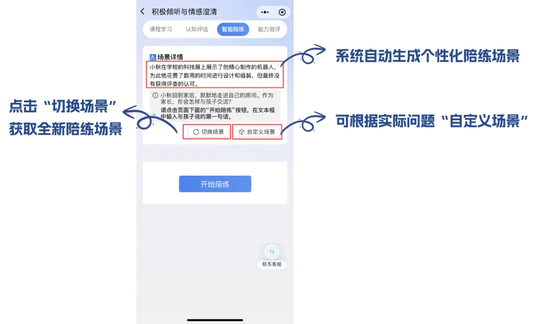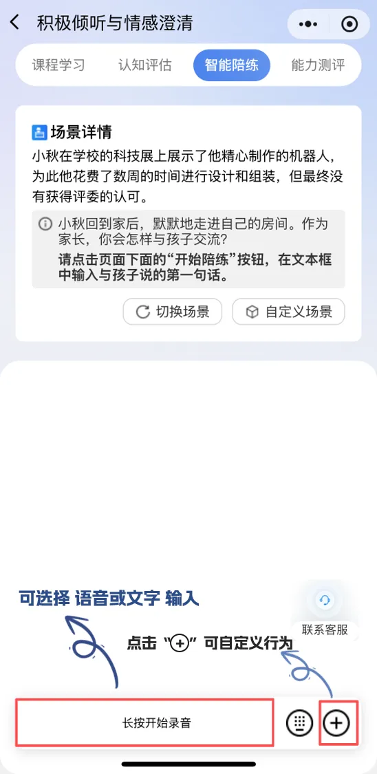 系统创设个性化亲子训练场景,大模型模拟“孩子”与您对话;点击“切换场景”重新生成场景,您还可以根据自己的实际问题来“自定义场景”。