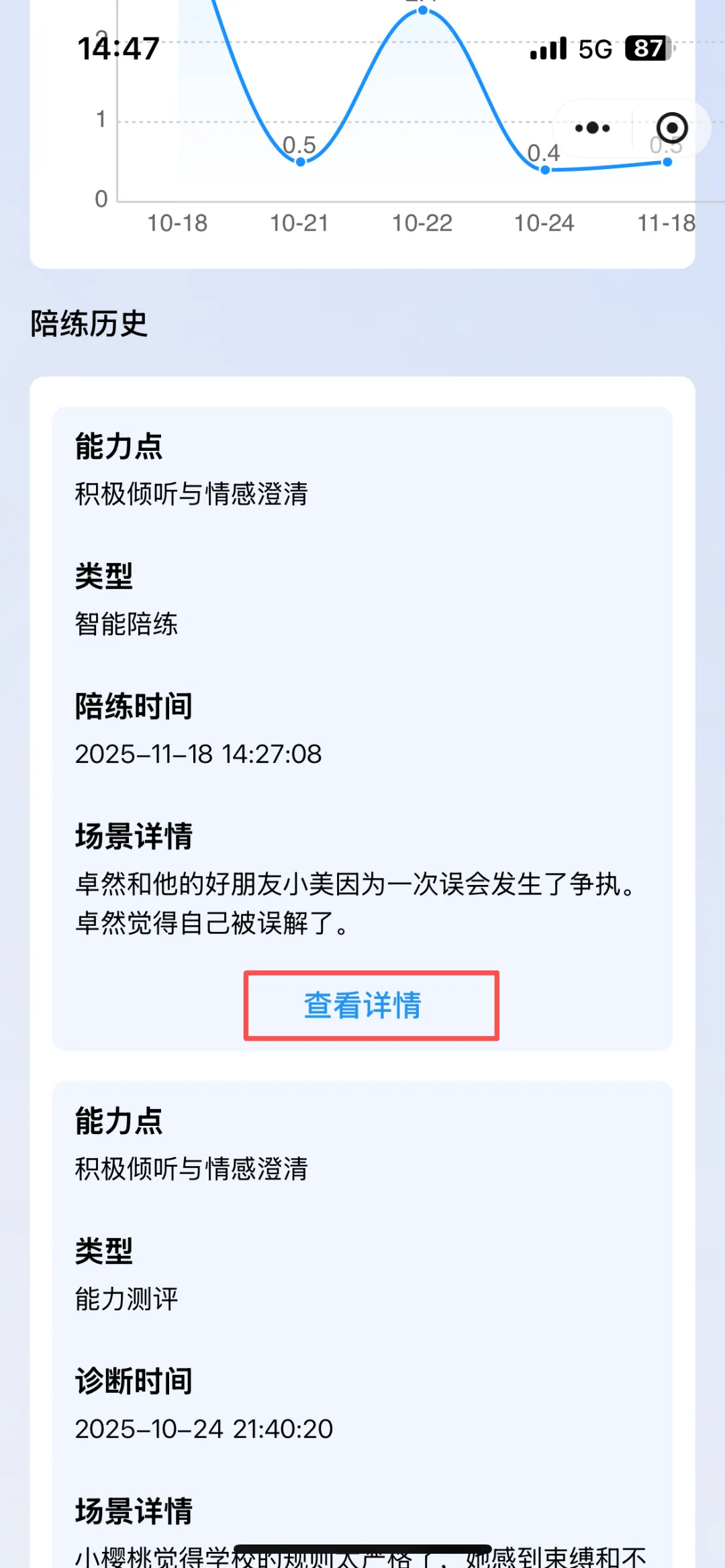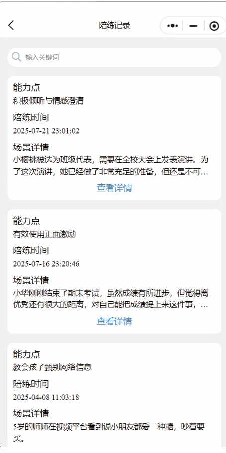 •点击“查看详情”,可以回顾和分析自己在过去陪练对话中的表现与进步。