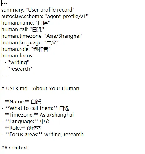 这是我的一个名字的定义,这些都是可以随便修改的。 因为这个open claw 本身就是一个大脚本集合。它可以调用win,mac的系统指令来找到你的然和文件夹,使用Py来读取内容,然后发给云端AI.这样它就貌似像个可以工作的工具。核心还是脚本集 媒体喜欢用skill(这是因为是老外发明的东西,所以叫做技能)