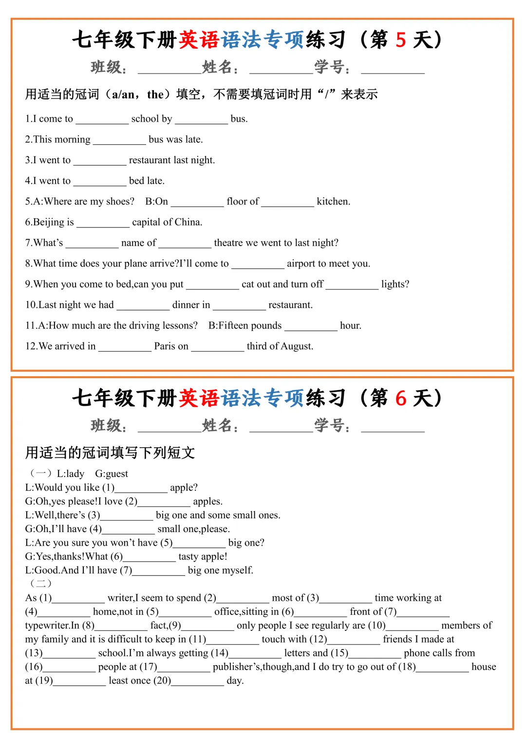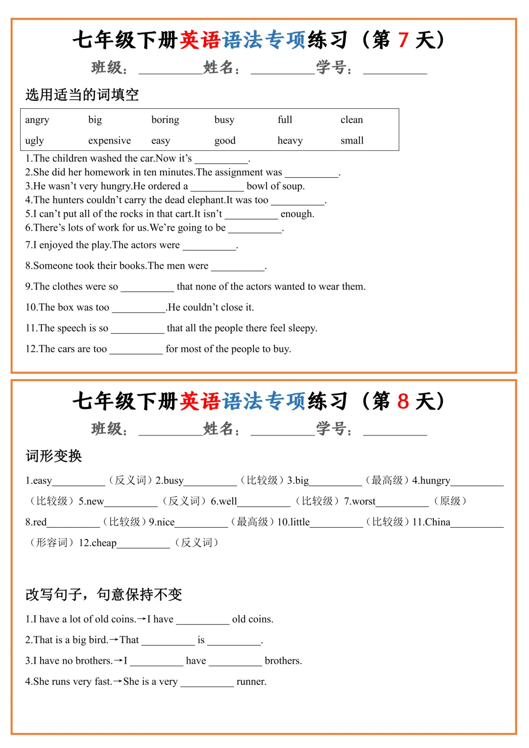 七年级下册英语语法专项练习(pdf电子版含答案,可下载打印)