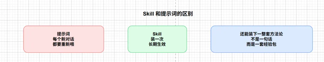 这是第一个区别:提示词是你每次要喂的,Skill是AI自己带着的。
