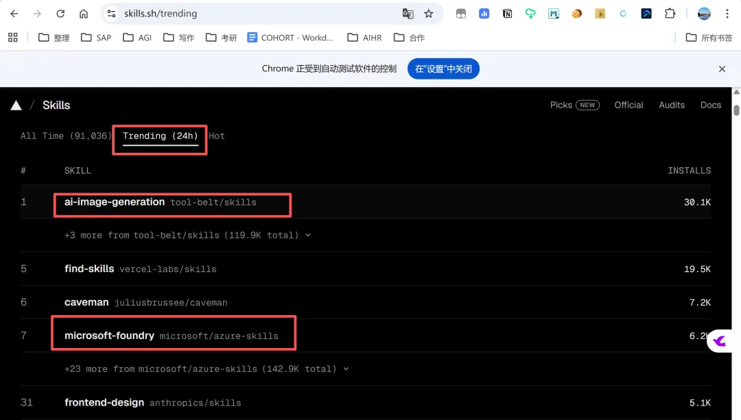 skills.sh(https://skills.sh/)— Vercel推出的,按24小时热度排名,看最近什么最火很方便。