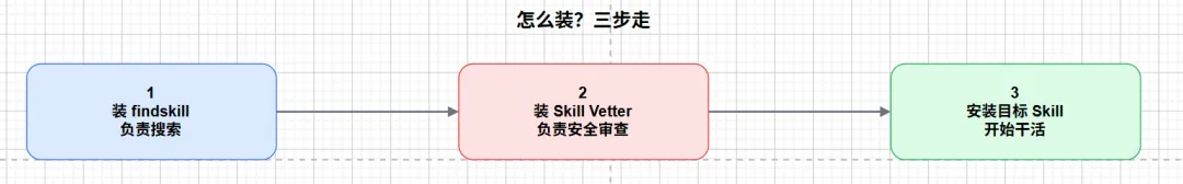 怎么办?装之前先装一个安全审查工具。ClawHub上有一个叫 Skill Vetter 的Skill(上面讲了),专门干这个事——装任何Skill之前先过一遍安全扫描,检查有没有红旗、权限有没有越界、有没有可疑代码。