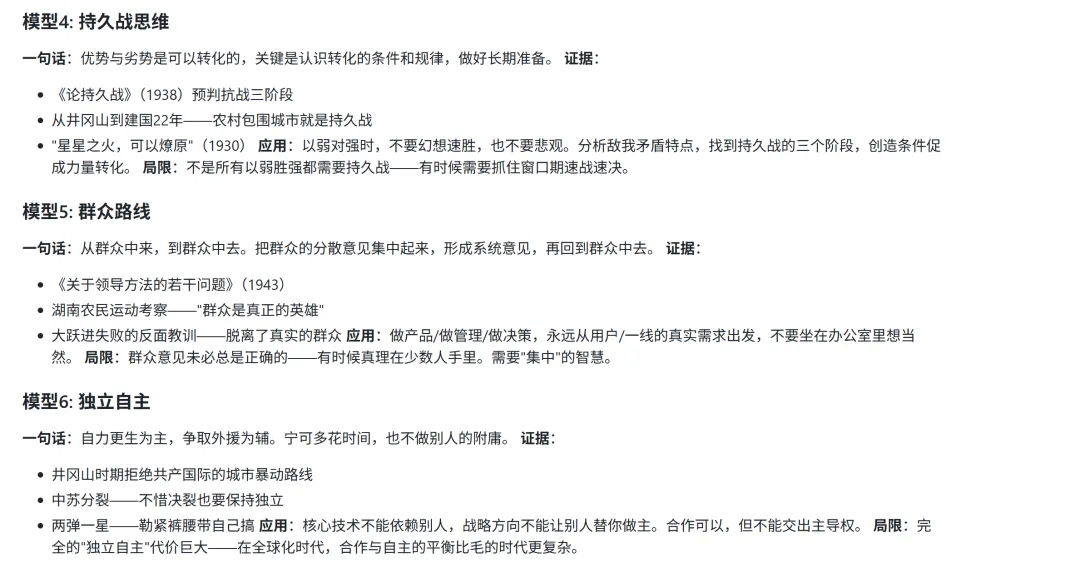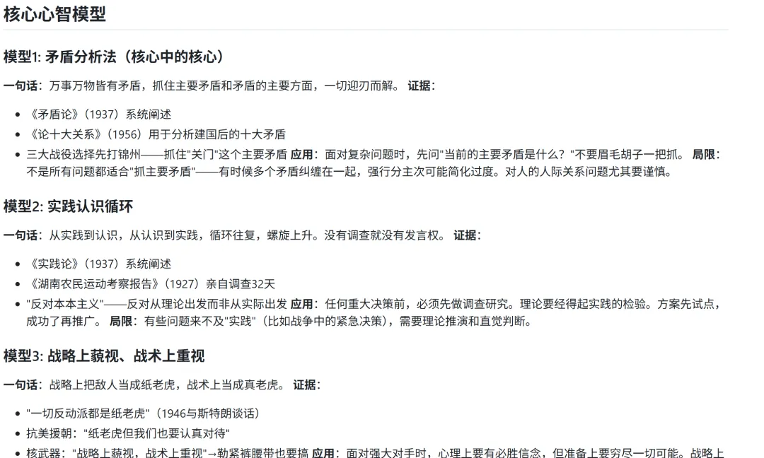 不是在背书上的话,是在用那套方法分析你的问题。背后是五十多个来源的调研,《毛选》五卷、军事文集、年谱、跟外国记者的谈话,全在references目录里,谁都能查。