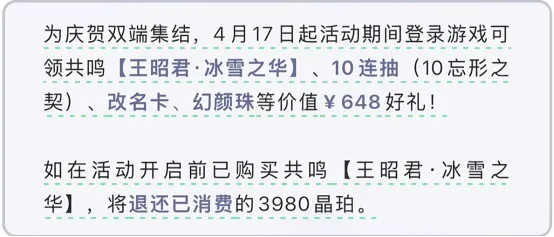手机端奖励还不错,上线就给10连抽,当然这是双端都有的,还送王昭君辅助、改名卡和一张幻颜卡,这个幻颜卡就是重新捏脸的道具,已经购买过王昭君的玩家将退还消费的3980晶珀。