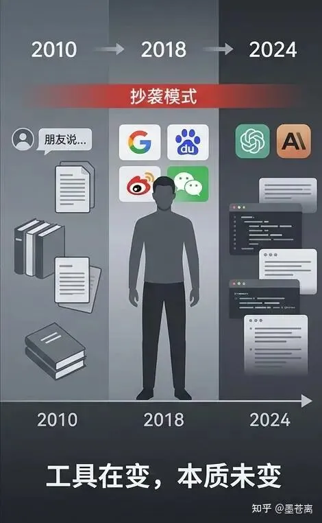 以前你遇到问题,去抄袭百度或者图文社区的办法。现在你遇到问题,抄袭 AI 的办法。抄的对象升级了,抄的本质没变。你担心的是一种模糊的、自己也说不清的「我是不是变笨了」的感觉。但这个感觉指向的不是 AI 的问题,是你终于隐约意识到自己从来没聪明过。