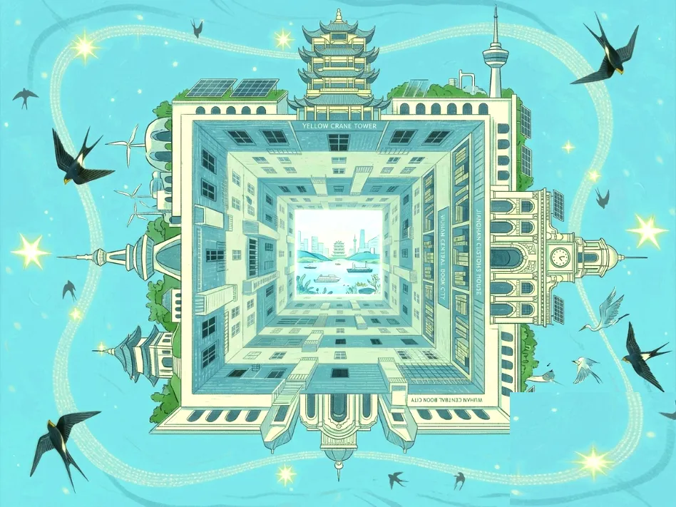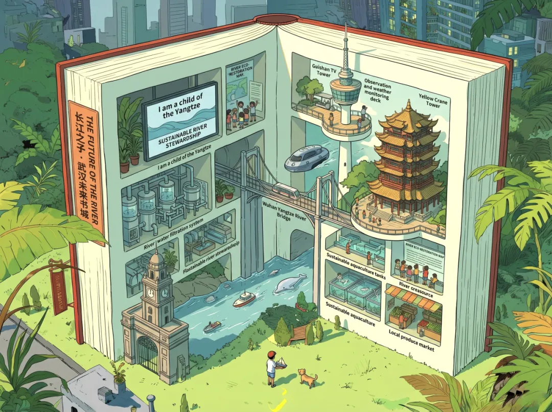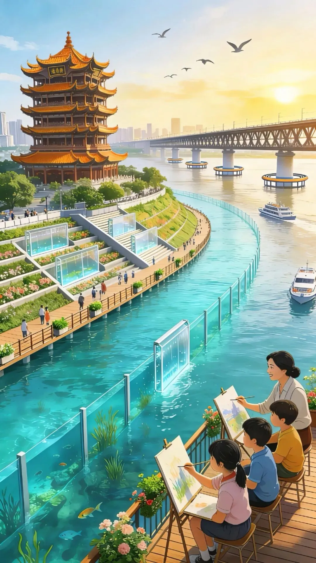 设计说明:这幅插画以豆包AI工具创作,聚焦武汉黄鹤楼与长江大桥经典景观,以暖色调夕阳铺陈画面,传统古建筑与现代都市天际线交相辉映,尽显江城底蕴。画面左侧,黄鹤楼飞檐翘角、金瓦生辉,长江大桥钢铁桁架横跨江面。中央创新打造半开放式生态水廊,玻璃幕墙分隔水体与步道,水下鱼群、水草构成“水下森林”,木质栈道蜿蜒其间,尽显生态设计理念。前景中,老师带领孩童临江写生,专注创作的场景传递艺术温情;江面游船往来,空中飞鸟成群,勾勒出历史名城生态宜居、人文与自然共生的美好画面。