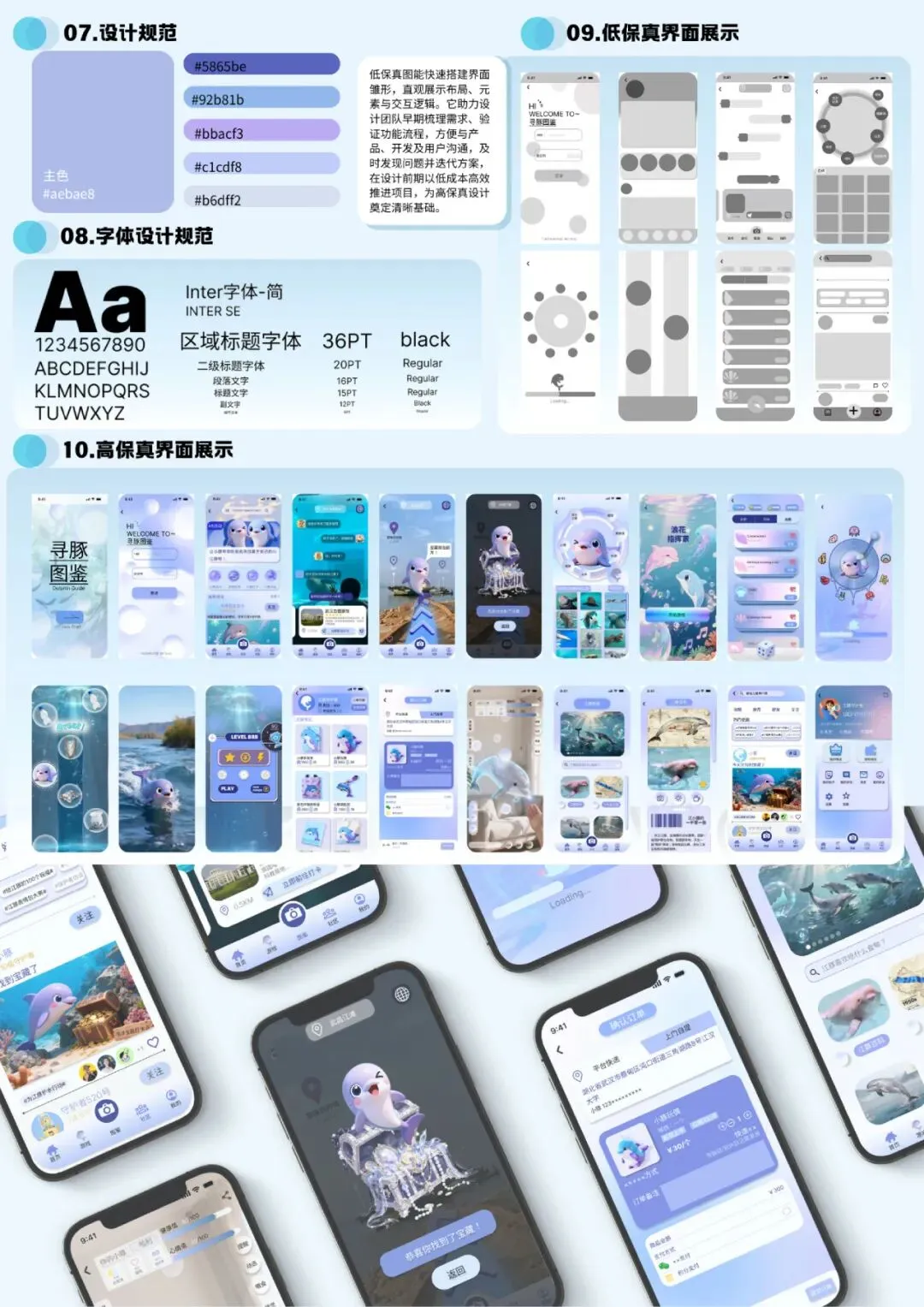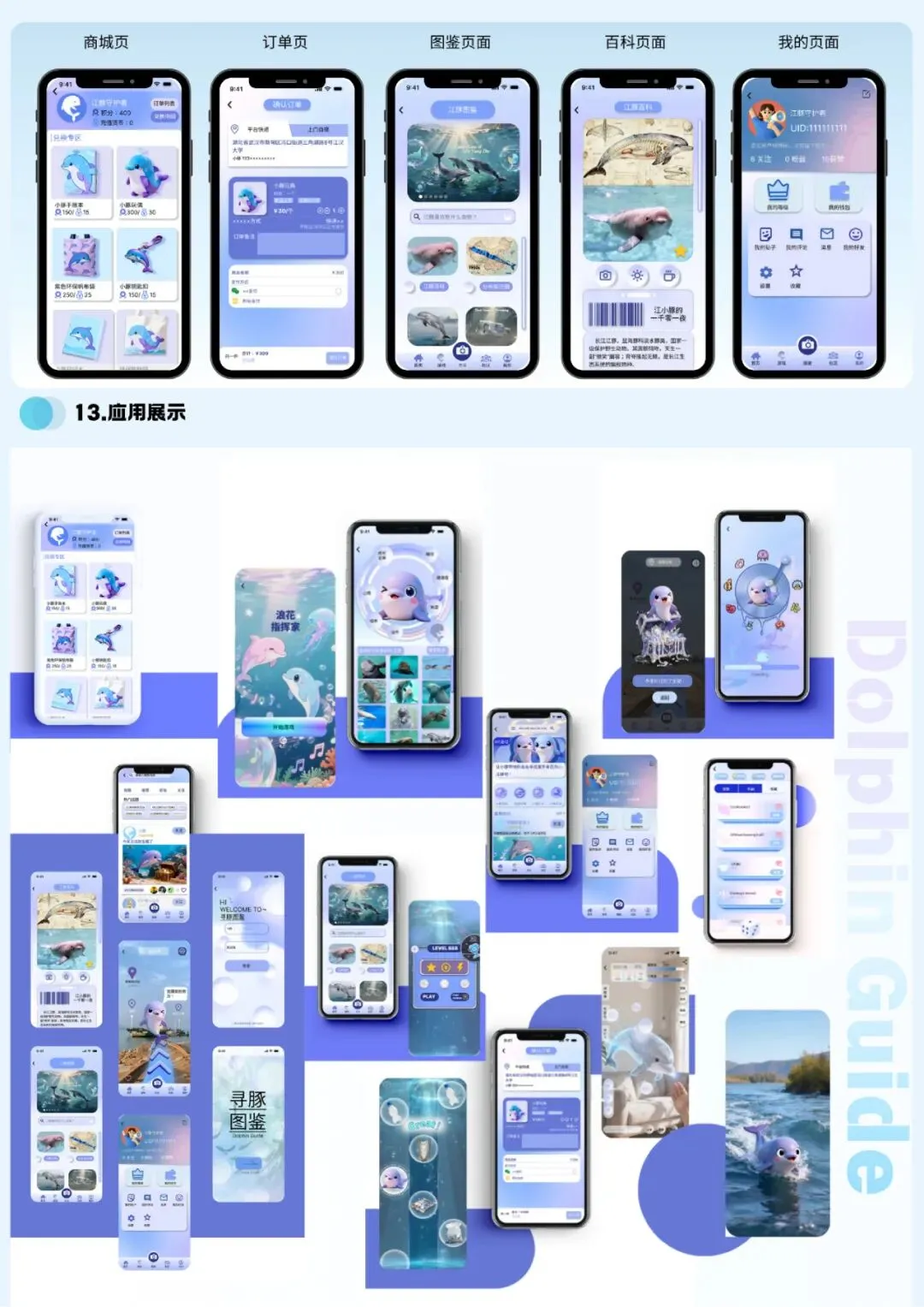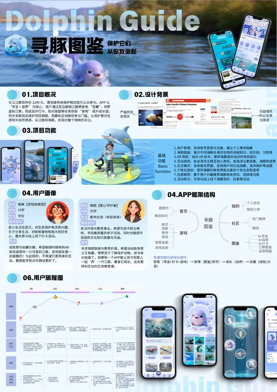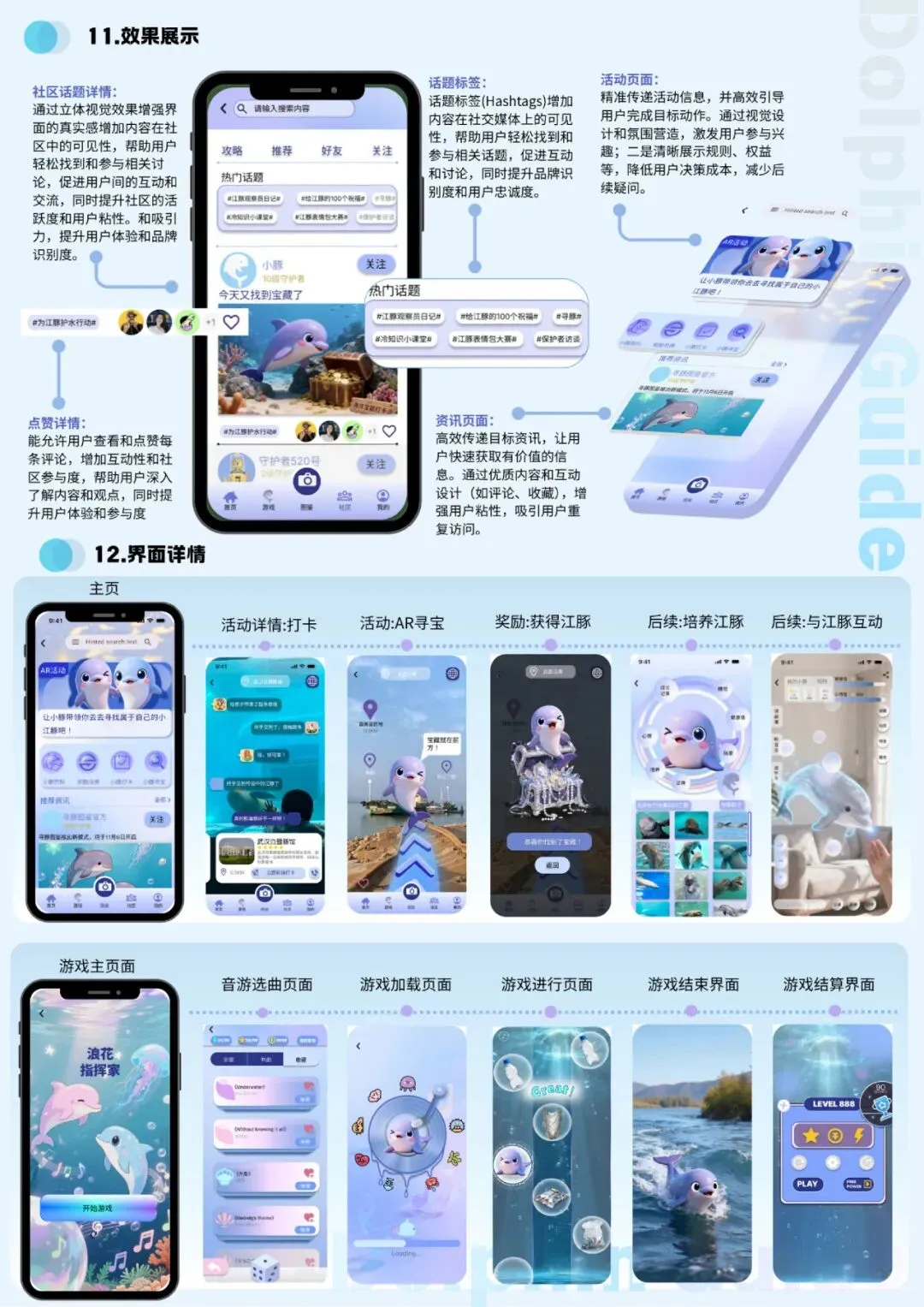 设计说明:长江江豚现存仅 1249头,需突破传统保护模式吸引公众参与。APP以“寻宝+自养”为核心:用户通过定位解锁江豚栖息地“宝藏”,领养虚拟江豚,完成巡护打卡、知识答题等任务获取“食物”提升成长值,同步关联现实保护项目捐赠。用趣味互动降低参与门槛,让保护意识在游戏中自然渗透。从江豚到海豚,实现对整个物种的关注。