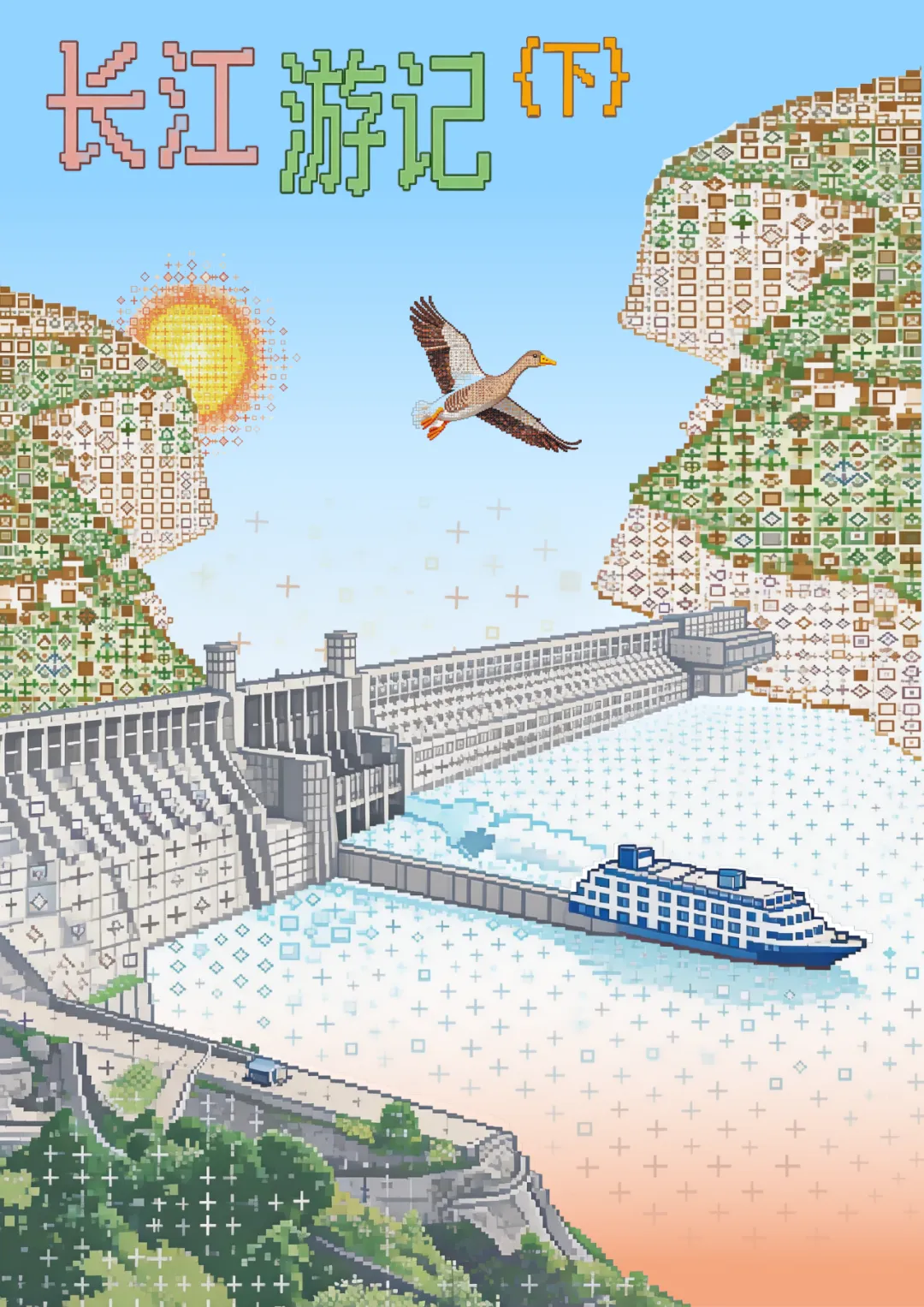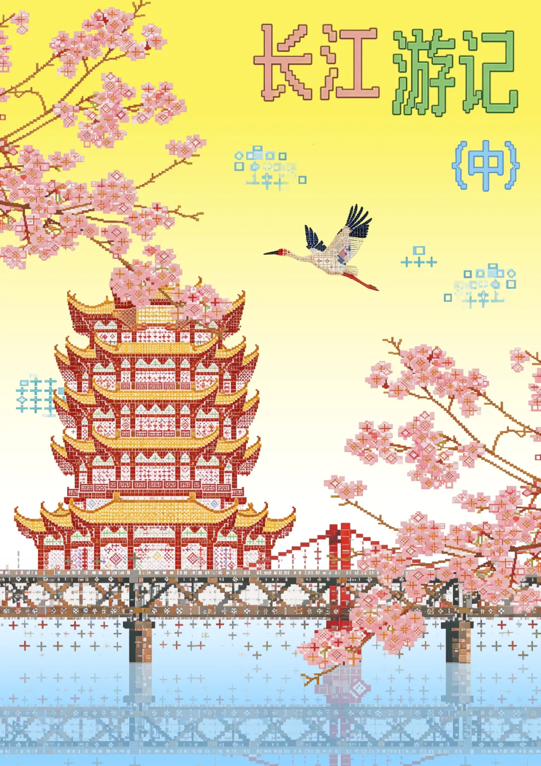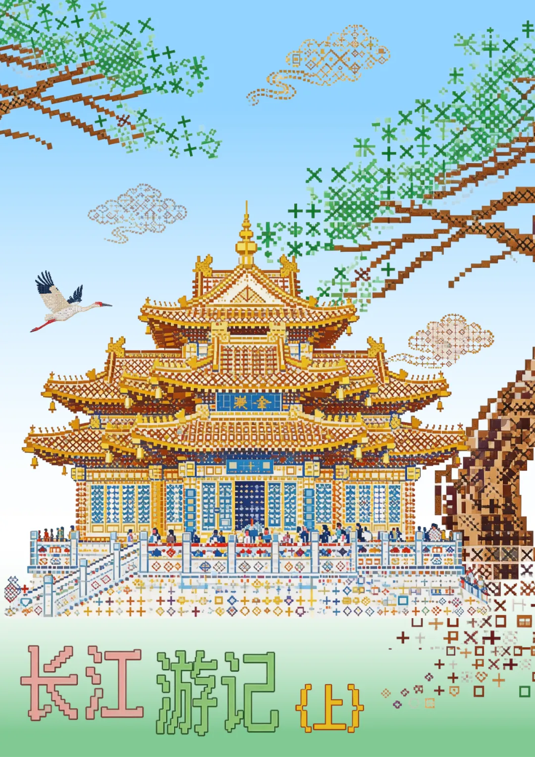 设计说明:本系列海报以“长江游记”为主题,选取武当山、黄鹤楼与长江大桥、三峡大坝等长江沿岸代表性景观,采用几何菱形拼贴风格进行视觉重构。创作过程中,首先收集各景点的实景图片,导入“即梦”AI工具,通过设置参数,将自然山水与人文建筑转化为由十字形、菱形、正方形等基础几何符号构成的抽象图形。AI生成的素材保留了景点核心辨识度,同时赋予其像素化的趣味质感。同时我进行主观的二次创作,调整画面疏密关系,强化节奏感;重组元素布局,形成稳定的构成关系,统一三张海报的视觉序列,最终用几何语言讲述长江故事,在简洁与丰富之间寻找平衡,呈现长江沿岸文旅资源的别样风貌。