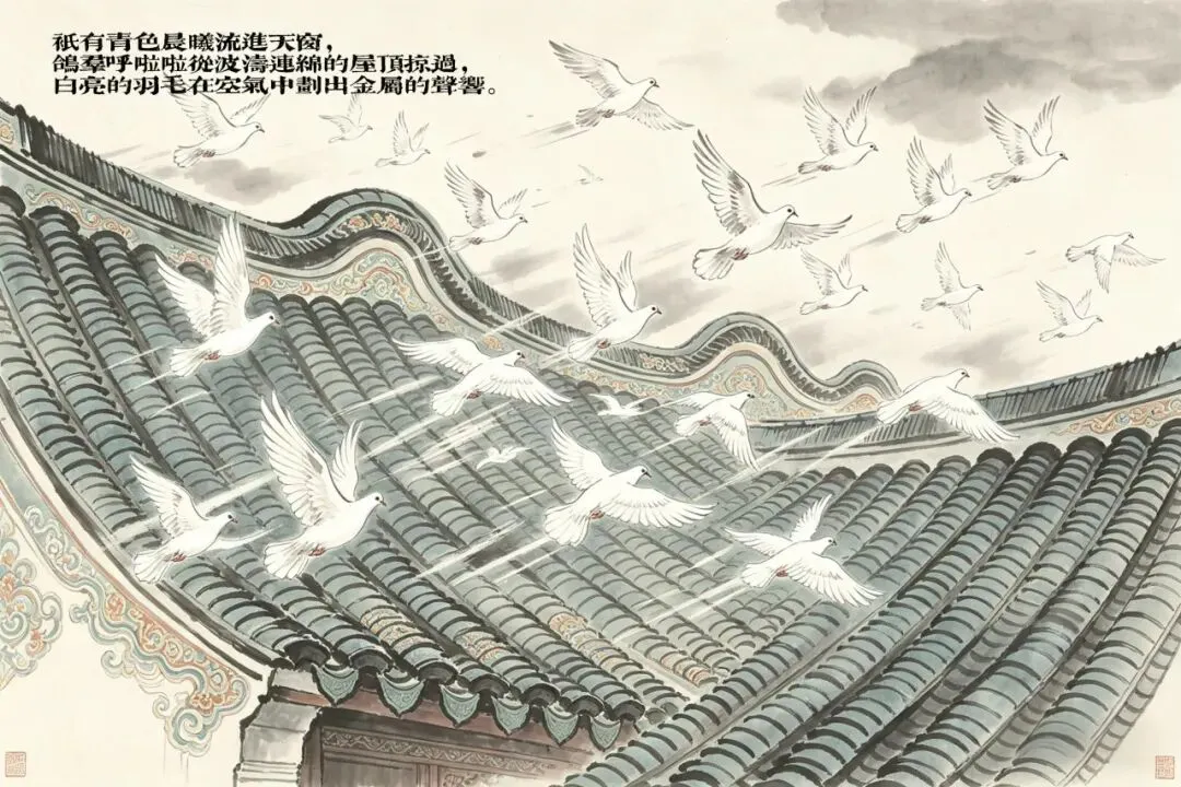 设计说明:本作品文稿参考丛书系列中《梨树的左边是槐树》故事,以AI水墨为载体,以长江流域江南水乡为创作基底,围绕「书韵长江·经典新生」主题,用传统国画的笔墨语言重构当代人文意境。开篇以栖镇沿河的青砖木楼、爬藤花树,定格长江沿岸的经典水乡风貌;再以青瓦飞檐间掠过的白鸽,书写江风里的生机与希望;继而以木槿花下的少女身影,勾勒烟火人间的温柔诗意;最终以雨夜路灯下的读书身影,呼应「书韵」内核,让长江文化在传统水墨与AI创作的碰撞中完成新生。作品既保留了中式水墨的留白、晕染之美,又融入当代审美,展现长江文化的厚重底蕴与鲜活生命力。