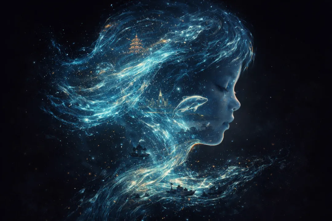 设计说明:本作品以“长江的孩子”为核心意象,将流动的水体抽象化为少女侧脸轮廓,表达人与长江之间深层的情感联结。画面以发光的水流构成主体,在其中融入江豚、船只与城市等元素,使自然生态与人类文明在同一流动结构中交织呈现。作品弱化具象叙事,通过留白与光影对比营造诗性意境,隐喻长江不仅是地理存在,更是承载生命记忆与文化延续的精神之河。借助AI生成技术实现复杂流体形态与细节融合,探索数字时代下长江文化的创新表达方式,并寄托对人与自然和谐共生的未来愿景。