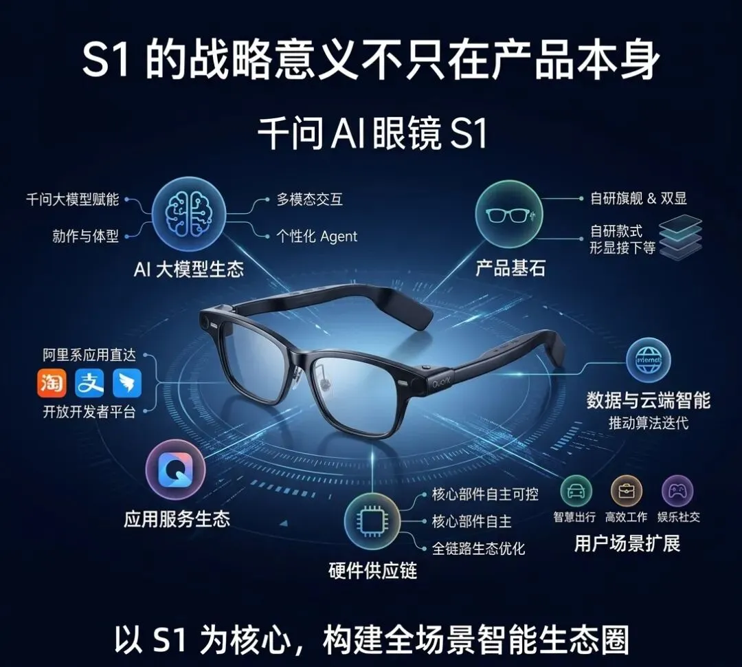 我对S1持“看好但不神化”的态度。接下来它至少要回答三个问题:稳定性门槛:复杂噪声、弱光环境下,功能下限能不能稳住?发售比的是上限,真实市场拼的是下限。而AI硬件真正的口碑,往往来自第“30”天,不是第“1”天。千问AI眼镜S1的意义,不在于“它有多少功能”,而在于它把行业焦点从“概念演示”推进到“真实可用”。它可能不会立刻成为全民刚需,但它已经证明:AI眼镜不是伪需求。推荐买:高频通勤、差旅、跨语言、爱好体育锻炼、轻办公用户;从行业节奏看,AI眼镜正从概念展示进入实用竞争。S1是一个典型样本:产品化优先于炫技化。S1的战略意义不只在产品本身,而在生态协同:AI模型、服务网络与硬件终端如何形成闭环入口。