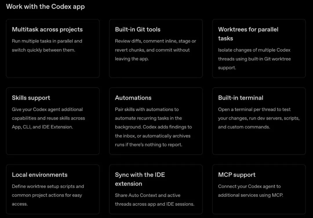 相对于使用 CLI 需要开多个窗口,或者结合 tmux 管理终端会话窗口。使用 Codex App 的话,直接就在一个界面中可以查看及管理所有并行工作的 Agent ,而不必切换来切换去。
