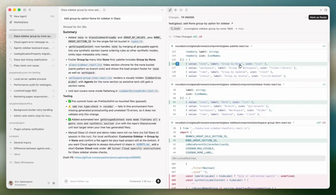 所以我们需要一个界面,在里面这种事情必须很自然,而且未来扩展到云端时也要非常顺畅。同时整个体验必须符合人机工学,不能让用户觉得自己是在很别扭、很费劲地折腾“如何同时委托多个 agent”,而应该让人感觉,这本来就该是最自然的工作方式。