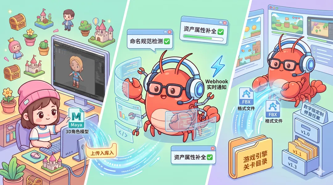 美术人员做完角色、场景、道具的 Maya 源文件后,得人工挨个核对规范命名、补齐资产属性,再手动设置参数导出 FBX 格式,最后还要逐一拷贝到对应游戏关卡的引擎目录、手动登记版本归档。