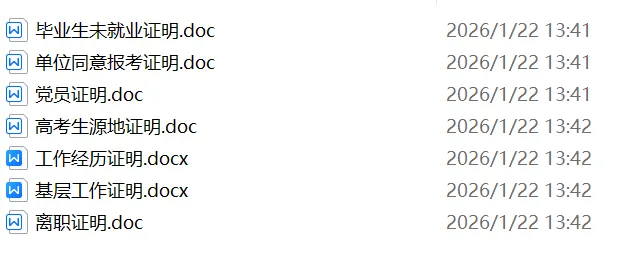 4、有基层工作经历要求的:提供工作经历证明。限定生源地(兵源地)的:提供生源地/当前户口所在地的相关材料。证明生源地的有效材料为:全日制普通高等院校毕业的人员须提供入学时的户口簿(原件,复印件留存;下同),非全日制普通高等院校毕业的人员须提供户口簿或毕业登记表;户口所在地材料,须2026年1月25日之前已办结落户手续的户口簿或集体户籍卡。报考面向退役士兵职位的人员:携带入伍通知书或县级武装部出具的入伍证明、退伍证原件及复印件。
