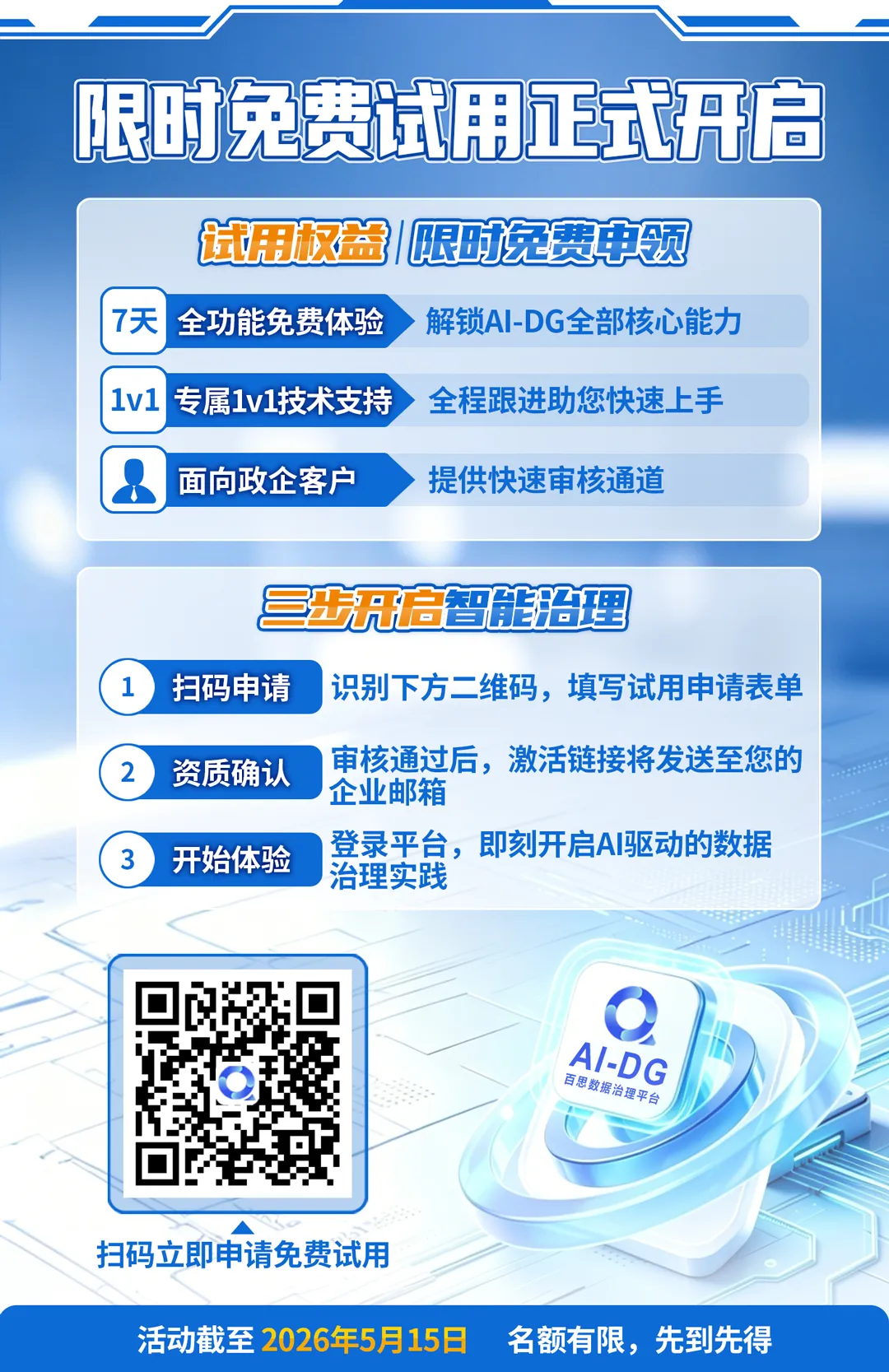 为了帮助更多政企客户真实体验新一代智能治理能力,百分点科技即日起正式启动AI-DG限时免费试用活动。