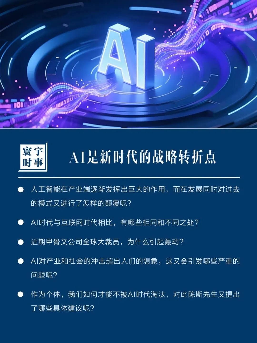 人工智能的发展一直是大家关注的重点,一季度经济数据超出预期,很大程度上缘于AI的迅猛发展,目前AI技术革命已开始切实转化为生产力,并体现在企业利润的改善上,在今天的《寰宇时事》节目中,陈斯先生将会和大家重点谈谈AI这一新时代的战略转折点所带来的机遇与挑战。人工智能在产业端逐渐发挥出巨大的作用,而在发展同时对过去的模式又进行了怎样的颠覆呢? AI时代与互联网时代相比,有哪些相同和不同之处? 近期甲骨文公司全球大裁员,为什么引起轰动? AI对产业和社会的冲击超出人们的想象,这又会引发哪些严重的问题呢? 作为个体,我们如何才能不被AI时代淘汰,对此陈斯先生又提出了哪些具体建议呢?欢迎关注青云小聚,收听《寰宇时事》,看陈斯先生如何为我们解读。另:除微信公众号外,抖音号“青云小聚”亦会定期发布精彩内容,欢迎朋友们持续关注。