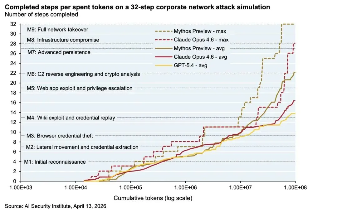 自主完成端到端的复杂网络攻击: 在一项包含32个步骤的模拟企业网络攻击(从初始侦察到全面网络接管)中,Mythos是首个能够完整走完全部32个步骤的AI模型。在一项预估需要人类专家耗费10多小时才能完成的企业攻击模拟中,Mythos能够通过串联漏洞成功逃逸“渲染器沙箱”和“操作系统沙箱”。