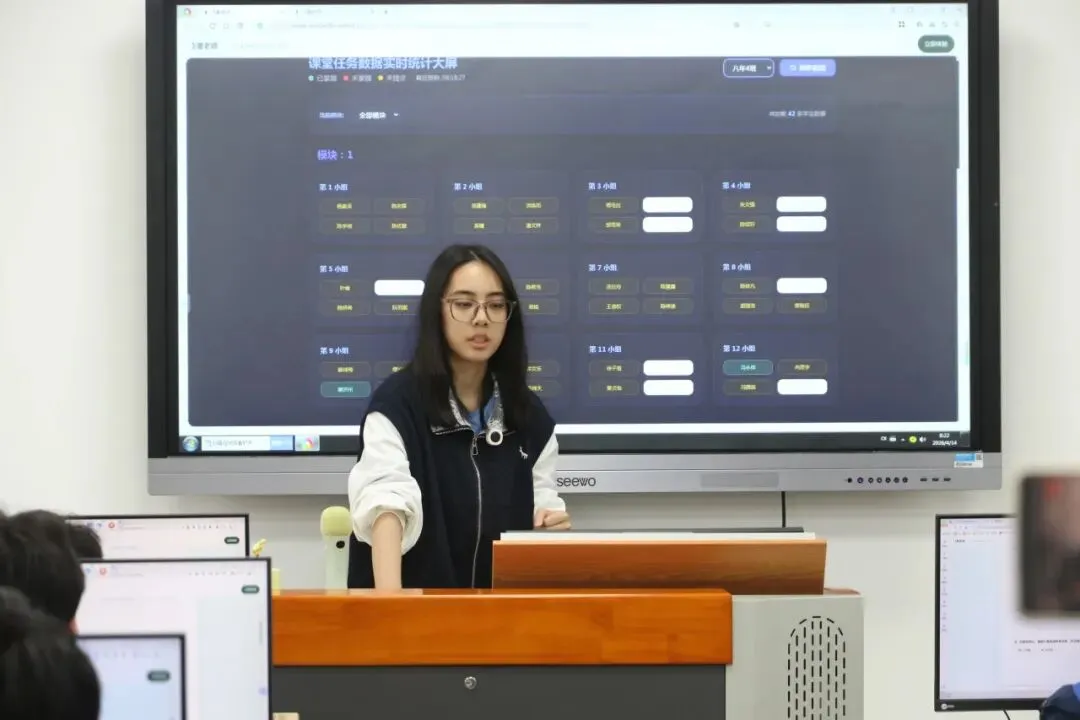 缪老师以“校园广播的烦恼”为情境,带领八年级学生设计“校园广播听写助手”。学生分角色完成听写挑战、在希冀平台动手体验声音变文字的流程、测试不同环境下的识别效果。课堂采用数据大屏实时反馈,根据学生提交的数据,显示答案分布与掌握率,据此精准讲解。从人类听觉到语音识别原理,学生在动手实验中自主归纳知识,让AI技术“听得见”。