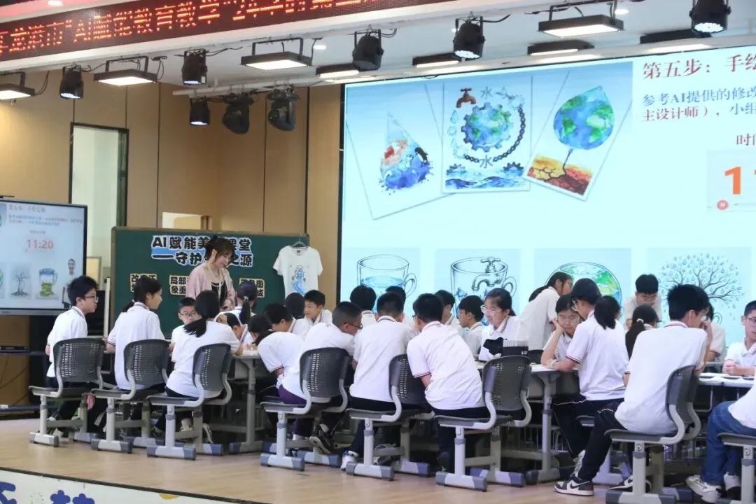 龙港市潜龙学校陈环老师携手七(6)班全体学生,共同呈现《AI赋能美术课堂——守护生命之源》一课。本节课紧紧围绕水资源保护这一极具现实意义的主题展开教学,巧妙借助“豆包AI”作为学生课堂学习的认知伙伴与创作助手,通过循序渐进的教学引导,带领学生深度探索水资源保护的核心议题,一步步完成从环保理念思考、创意构思到公益海报视觉表达的完整转化过程。在整个课堂教学过程中,引导学生主动发现、思考并尝试用美术创作解决实际问题,在沉浸式的美术学习与AI创作体验中,同步培育学生的艺术审美素养、美术创作能力以及爱护水资源、践行环保行动的社会责任意识。整堂课实现了现代数字技术与传统美育教学的深度融合、双向赋能,充分展现了数字时代背景下,素养导向型美术课堂的全新教学模式与创新实践。