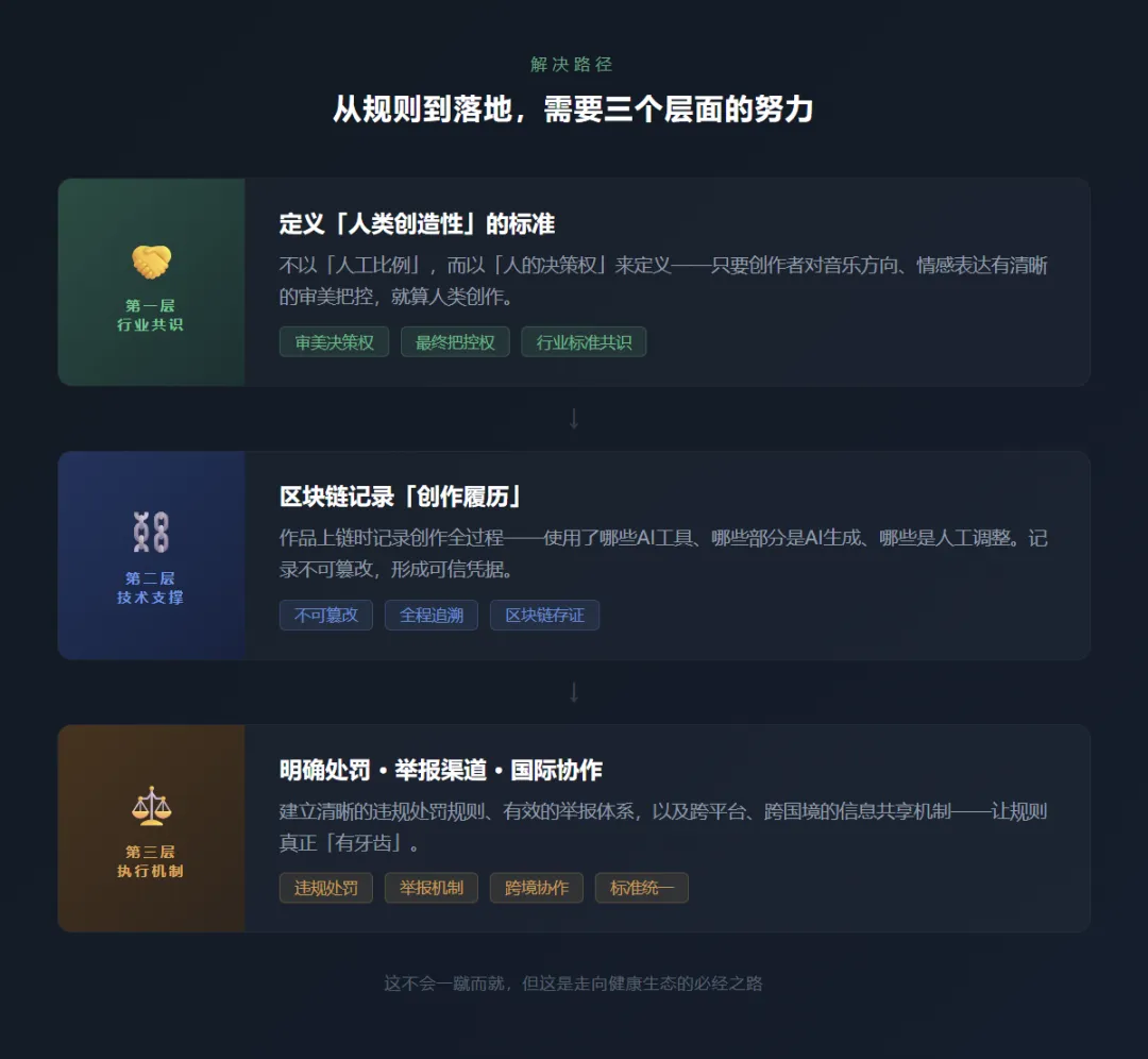 最后,整个音乐生态会变得更健康。因为那些试图钻空子、用纯AI生成的内容冒充人类创作的人,会被有效地制止。这样,人类创作者的价值才不会被无限稀释。