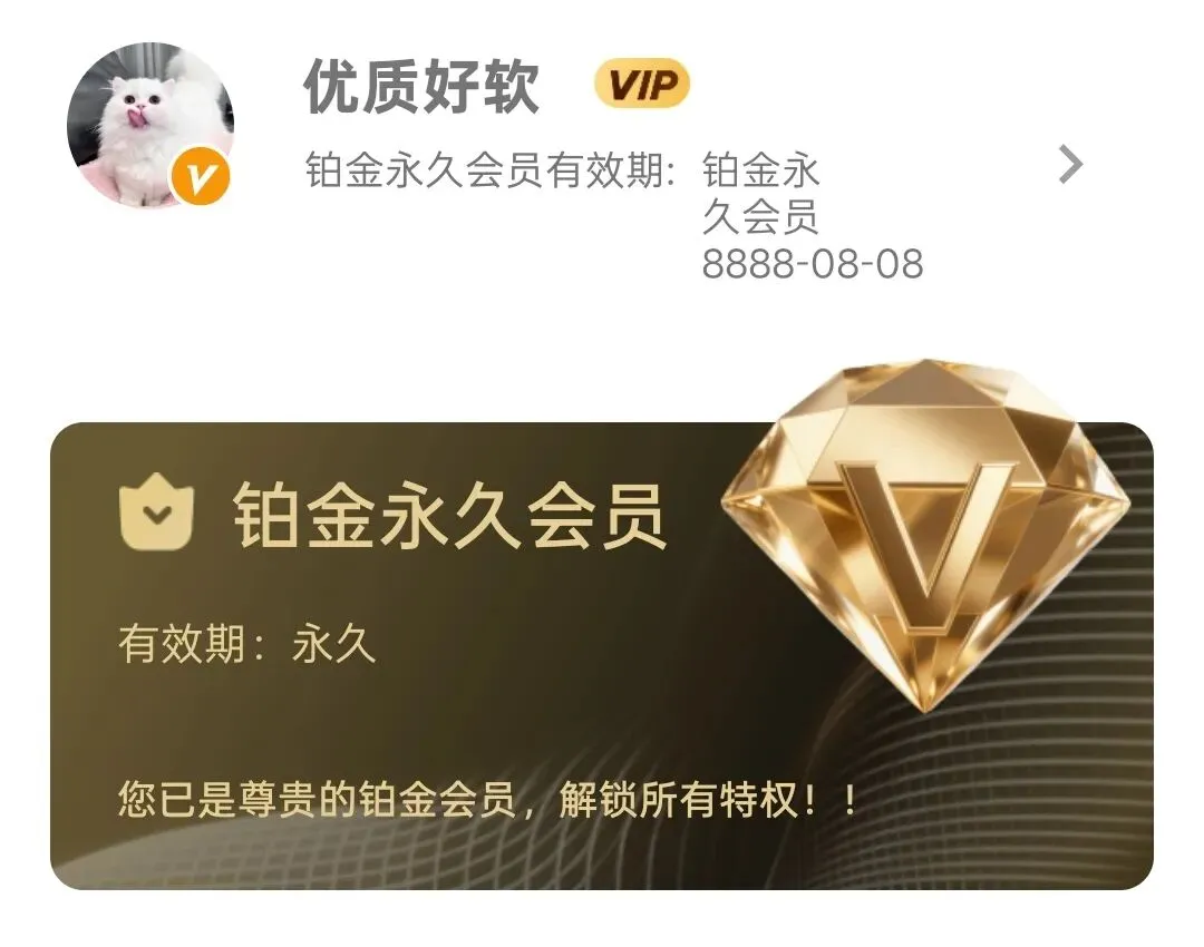 把界面切到“我的”,可以看到显示已经是铂金永久会员了,有效期永久,所以下载速度这么快是不是和会员有关,我不是很清楚,因为正式版的我也没有下载测试,如果有用过的,请一定换成这个版本,但也别忘了留言说一下区别。