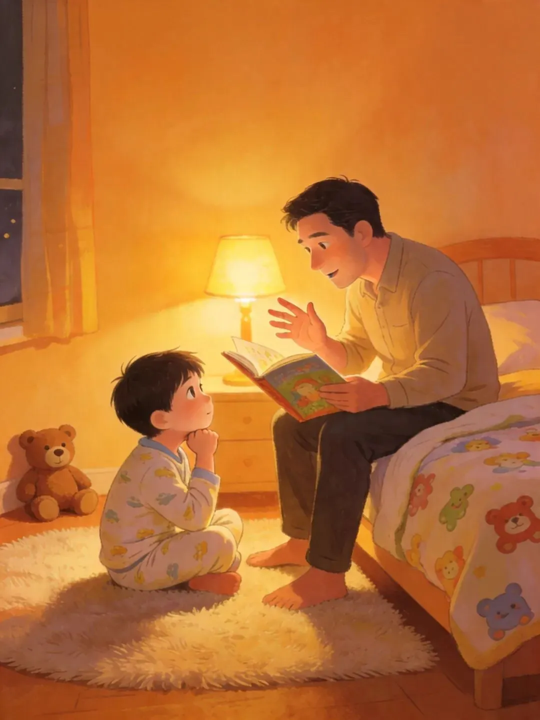 那天晚上,我硬着头皮现编了一个关于"会飞的乌龟"的故事。讲得磕磕绊绊,但他听得很认真,还时不时插嘴问:"那乌龟后来呢?它找到妈妈了吗?"