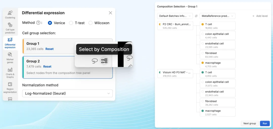 现在运行差异表达分析(DEG)时,可以通过细胞组成来选择细胞群——非常适合在多个批次间比较正常与疾病样本中的免疫细胞亚型。