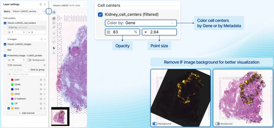 Preferences现在已经更名为Layer settings—可按基因或元数据为细胞中心着色,调整不透明度和点大小,并可移除免疫荧光(IF)图像背景,获得更清晰的可视化效果。