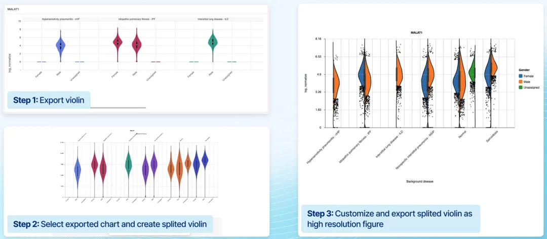 从任一平台导出小提琴图,然后在 BioVinci 中生成可直接用于文章发表的拆分小提琴图——只需简单三步,即可自定义分组与颜色,并导出为高分辨率图片。