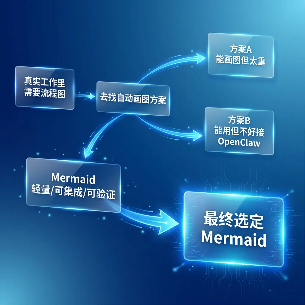 导读:很多 skill 不是“规划出来的”,而是在真实工作里被逼出来的。今天这篇,我想讲一个很典型的案例:一次团队讨论里,我脑子里突然冒出“这里应该有张流程图”,接着去 ChatGPT 网页端找轻量方案,最后把 Mermaid 真正落成了 OpenClaw 里的一个可复用 skill。