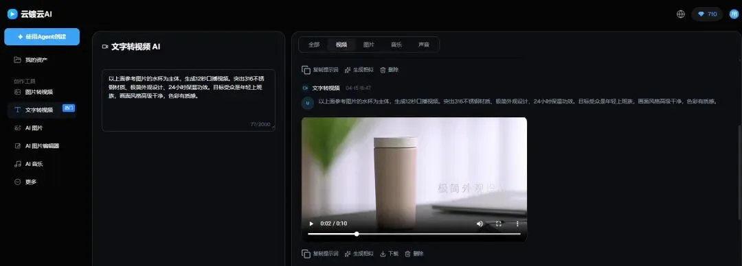 它能干什么?你只需要把刚才琢磨好的提示词喂给它,接下来几分钟,云镀云AI自动帮你产出: