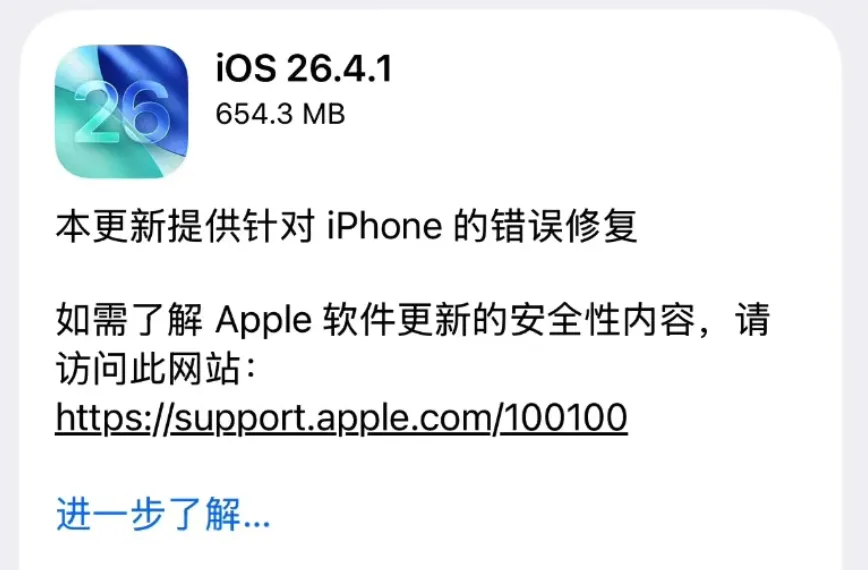凌晨悄悄推送 iOS 26.4.1,系统版本号 23E254,上次更新还在一周前,已经在 iOS 26 上的设备。