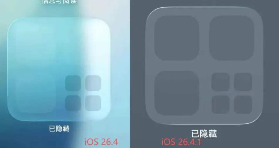 细节上也有小动作,App 资源库里的隐藏文件夹图标在深色模式下会异常显示,样式不统一,装上 26.4.1,深色模式里相关图标统一成深色风格。