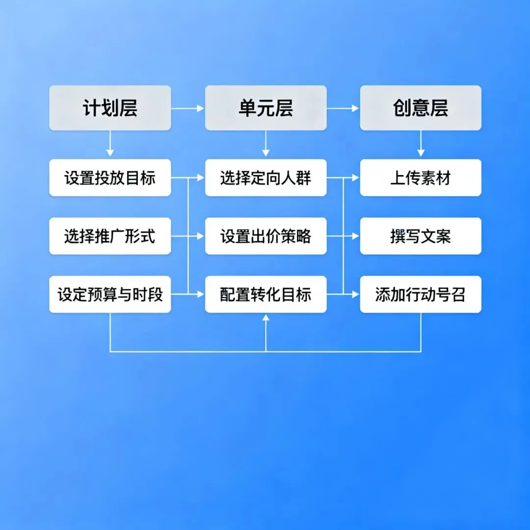 信息图,流程图,简洁商务风格主体:抖音本地推投放流程元素:计划→单元→创意,箭头连接配色:蓝色系,专业感比例:16:9出图效果: