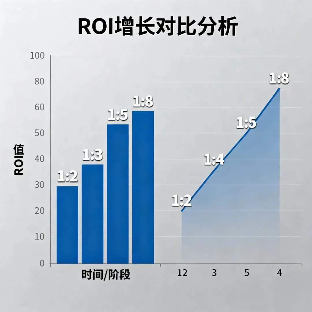 数据对比图,柱状图,商务风格主体:ROI 增长对比数据:1:2 → 1:8,增长曲线配色:蓝紫渐变比例:16:9出图效果: