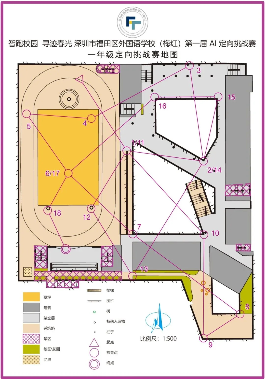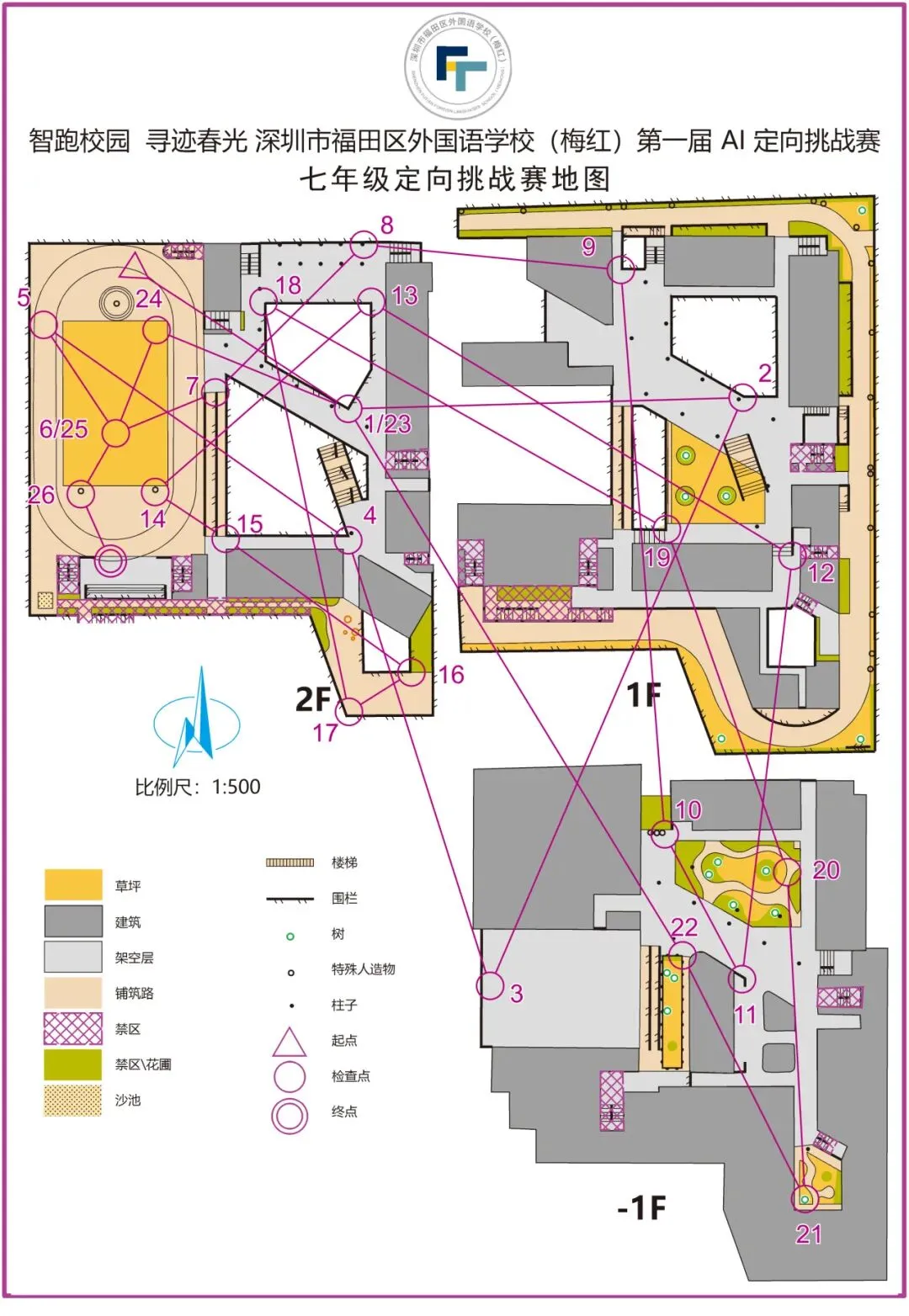 本次赛事精心打造校园专属定向地图,运用方向、比例尺、图例与注记三大地图要素,将教学楼、走廊、楼梯、架空层等校园实景转化为规范清晰的专业地图语言,培养学生区域认知、综合思维、地理实践力等地理核心素养。