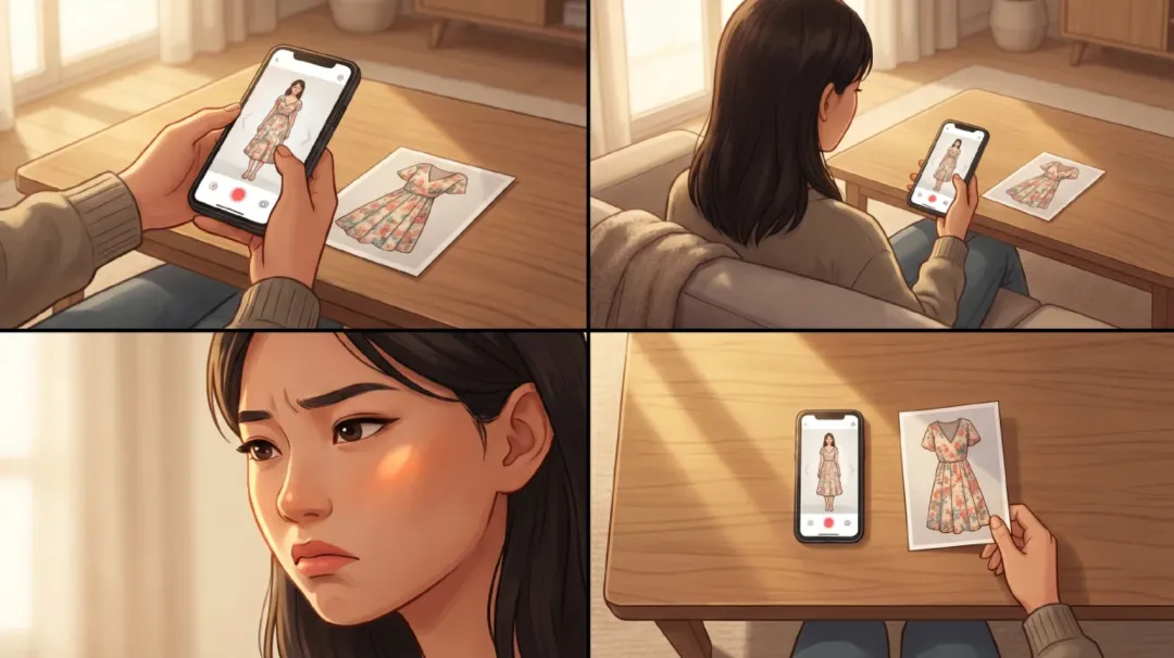 AI只能模拟衣服的轮廓和颜色。但面料垂不垂、弹不弹、透不透,AI不知道。同样的尺码,棉质和雪纺穿上身完全不一样。