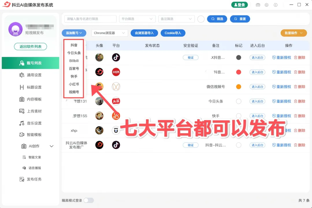 统一管理多平台账号(抖音、快手、视频号、小红书、B 站、今日头条、百家号等)