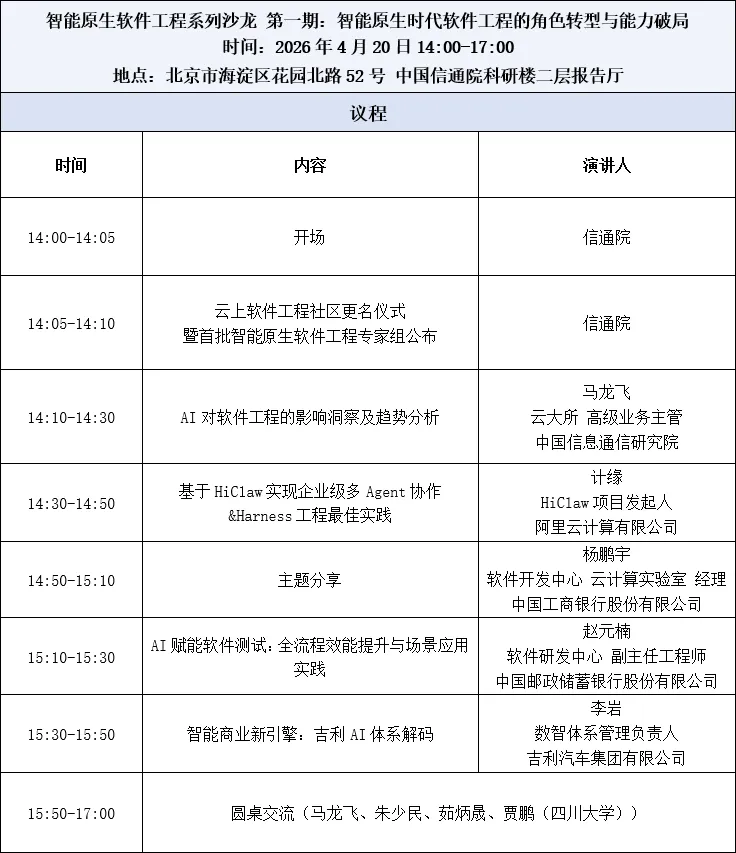 在此背景下,中国信息通信研究院将于4月20日在京举办智能原生软件工程系列沙龙第一期——“智能原生时代软件工程的角色转型与能力破局”,诚邀业界专家拨冗出席。本次主题沙龙正是围绕上述行业痛点与核心挑战,汇聚产学研各界先行者,直面问题、凝练路径,探讨AI与软件工程深度融合的实践路径与产业影响。