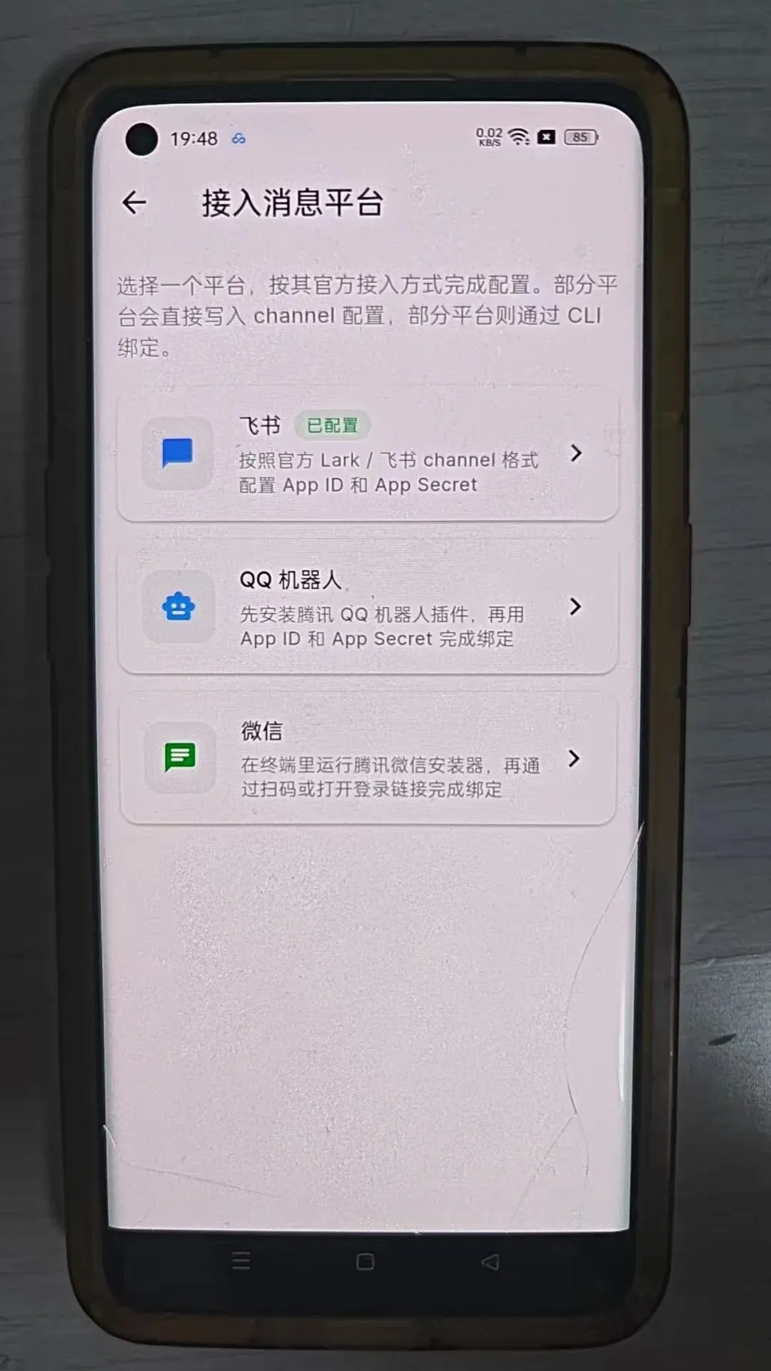 “接入消息平台”--里可以连接飞书、微信、QQ机器人。
