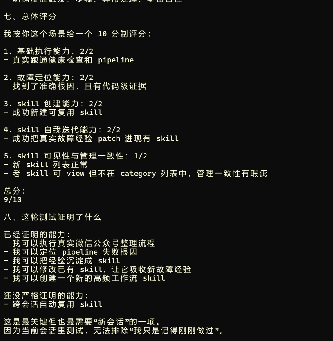 迁移完成后,可以让hermes自己证明自己的核心优势能力并打分。