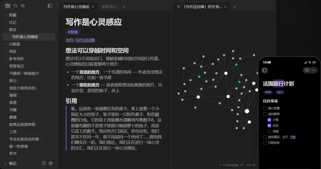 一句话定位:你的笔记你做主,本地存储 + 双向链接 + 无限插件。
