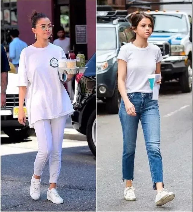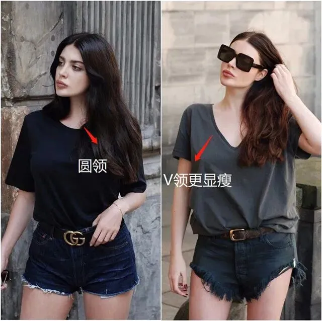 穿衬衫也好、T恤也罢,都要拒绝“模板化”,今年这4种穿法特新潮点击蓝色字免费订阅,每天收到这样的好信息入春之后,又是各种衬衫,T恤的主场了,几乎每个女孩子都开始穿上了这类基础的春装凹造型。而且通过这类基础的气质单品就可以承包你三四月份的时髦穿搭,作为潮人,我们穿衣服要拒绝模板化。想要穿出时尚感,那么选择衬衫和T恤的时候都需要借鉴一些小技巧,并通过独特穿搭技巧来修饰你的身材。所以接下来,我们会先分析一下,衬衫T恤的选择,选择合适的单品,才继续讨论如何搭配的问题。第一部分:衬衫、T恤如何选?说到衬衫和T恤,大家都觉得这是很基础的单品,选择起来还不简单,如果你这么想,那就大错特错了哦。1、领口设计想要提升你的时尚感,选择T恤和衬衫的时候都要注意领口。圆领和v领的选择还是很简单的,想要显瘦就选后者。V领的剪裁很立体,修饰颈部曲线的效果也很明显,上半身胖的mm就不要纠结了。根据下面的对比图我们可以看出来,明显V领的视觉显瘦效果更好一些,主要是V领比圆领的露肤面积更多一些,而且显得轻盈许多,自然就可以拉伸你的上半身,降低重量感。2、版型问题针对衬衫和T恤的选择,版型也是一个十分关键的问题,想要显瘦,可以先去考虑修身的T恤,修身设计不需要太紧,贴合你的身材就好。太宽松的话其实不太好驾驭,也会觉得虎背熊腰,所以一定不要为了遮肉去尝试大一号的衬衫或者T恤。3、颜色因素色彩会对咱们的气质产生一定的影响,如果你想要选择合适的配色来凹造型,首先要明白你适合深色还是浅色。浅色的T恤或者衬衫更清爽一些,但是不适合上半身壮实的女性,如果你追求显瘦,可以尝试百搭的黑色,无论本身的身材胖瘦,穿上都会觉得很显瘦。第二部分:穿T恤、衬衫的小技巧?为了拒绝模板化的穿搭,咱们穿衣服的时候也要结合一些小技巧,选择衬衫和T恤凹造型的时候,下面几个小技巧都值得借鉴哦。1、塞衣角显高法小个子女孩应该都知道这个方法吧,塞衣角显高的技巧对于那些腿短,比例不好的小姐姐来说简直就是福音。我们可以把衬衫或者T恤塞进裤腰之中,这样就可以很好的修饰下半身比例,塑造大长腿。塞衣角的目的就是为了提高我们的腰线,如果你担心身材不是很好,那么还可以借鉴腰带的加持,修饰你的身材,打造出大长腿~搭配示范:衬衫+高腰牛仔裤如果想要完美的诠释塞衣角方式,一定要选择高腰牛仔裤,不管是低腰还是中腰的裤子都不行,必须是高腰的设计才能够显示你的好身材,避免显得身材五五分哦。再加上下面塞衣角的方式,就可以很好的分割上半身和下半身比例啦。2、衣摆打结显瘦法其次,不喜欢塞衣角的小姐姐还可以试一试衣摆打结的方法哦,通过给衣摆打个结。能够很好的修饰腰线,诠释出你的小蛮腰,甚至可以打的结高一些,露出你的腰肢,不经意间凸显性感气质。不过衣摆打结的方式还是蛮考验技术的,打结不能太大,不然就会觉得很累赘,导致你的腹部看起来超级臃肿哦~搭配示范:T恤+半身裙如果身材足够苗条,可以试一试短款T恤搭配高腰半身裙,顺便可以把衣角系起来,打个结的效果会更好看。这种露腰小技巧是很实用的,咱们想要露腰的时候就露,不想露的时候可以把打的结解开,这样就可以更好的诠释不同风格啦。3、叠穿增强层次感叠穿搭配的小技巧已经说得很多了,无论是衬衫还是T恤,其实都可以把叠穿技巧运用起来。但是叠穿的时候要注意,衣服的层次感和风格一定要能够融入起来,不然叠穿搭配很容易觉得繁杂,起到适得其反的效果 。搭配示范:西装+T恤其实外套就很适合搭配T恤或者衬衫,这种叠穿搭配也是最常见的, 不容易出错。比如我们可以借鉴绿色西装和白色T恤的叠穿搭配,撞色搭配凸显出了时尚感,同时还能够体现出层次,避免单一的搭配太单调。虽然T恤和衬衫都是一些基础单品,但是咱们搭配的时候还要运用一些小技巧才行。我们日常搭配也不要总是模板化的去穿,可以多变化一些小技巧,通过不同的方式来修饰你的身材比例,并且提升你的气质吧~