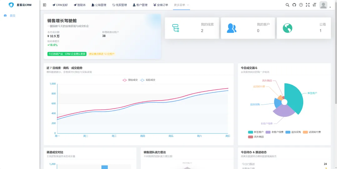 :在系统首页展示今日待办事项、跟进提醒信息以及团队最新动态。用户可清晰了解自己当天的工作任务和需要跟进的客户,同时及时掌握团队的工作进展,促进团队协作和沟通。