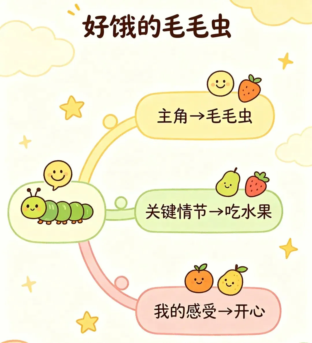 完成后,让孩子用简单的话,结合思维导图,概括一遍故事内容,强化理解。