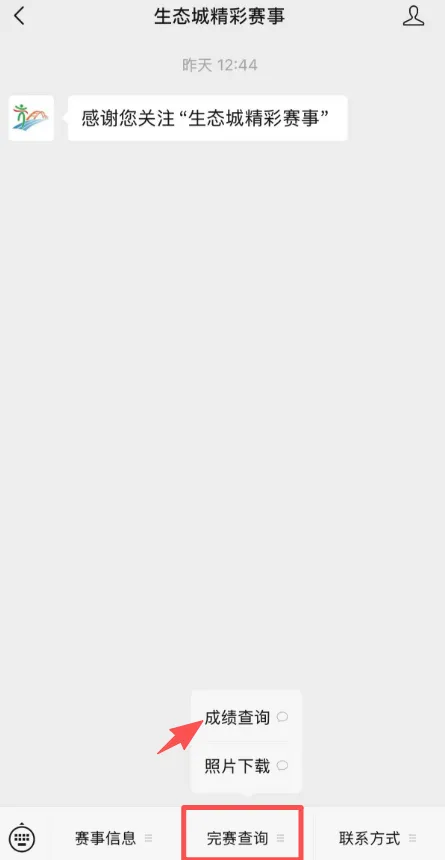2.进入公众号菜单栏,点击【完赛查询】→【成绩查询】。