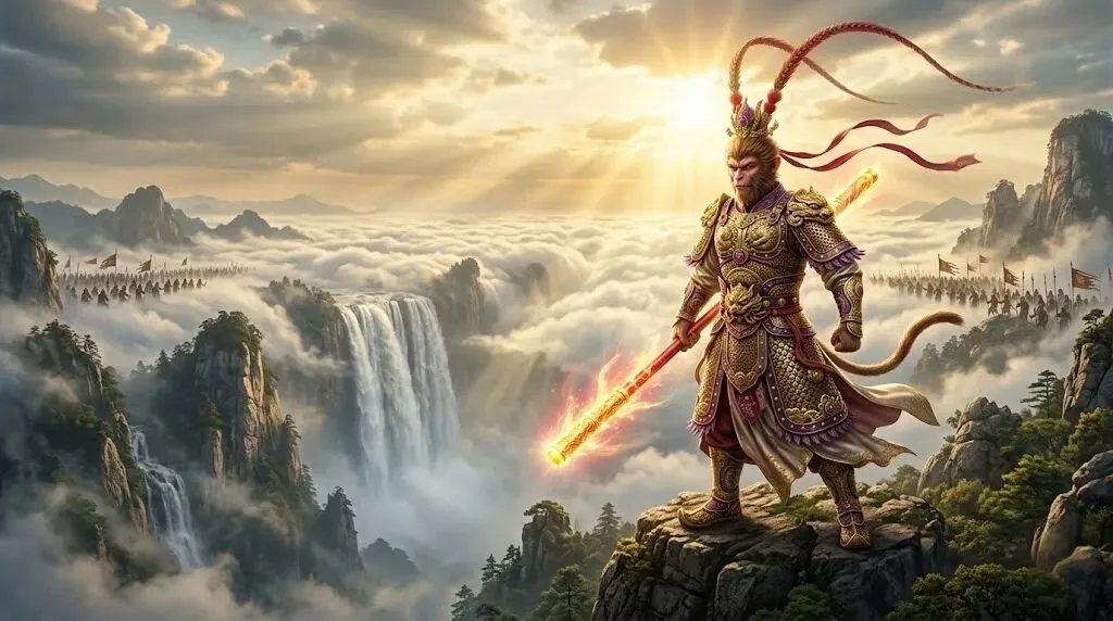 Sun Wukong the Monkey King, wearing ornate golden chainmail armor with phoenix-wing purple gold crown, standing on the peak of Mountain of Flowers and Fruit, holding the Ruyi Jingu Bang glowing with divine light, stepping on lotus silk cloud-treading boots, behind him a vast sea of clouds with a magnificent waterfall cascading down, golden sunbeams piercing through clouds creating a sacred halo around him, thousands of monkey soldiers lined up in formation in the distance, epic cinematic composition, dramatic lighting, Chinese mythology, hyper-detailed armor textures, volumetric fog, 8K resolution, masterpiece, --ar 16:9 --v 6